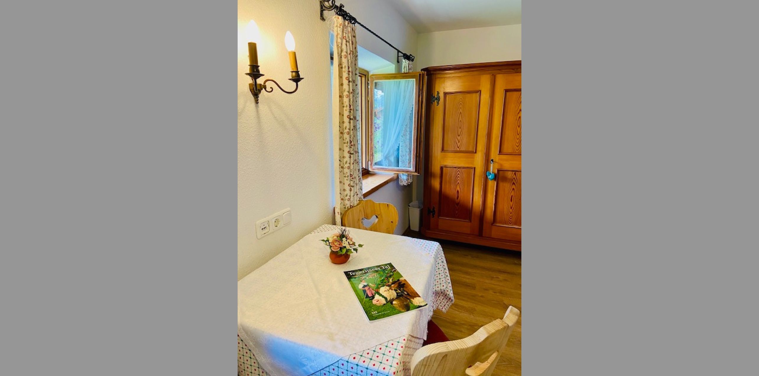 Unser kleines (22 qm), liebevoll mit Bauernmöbeln eingerichtetes Einzimmerapartment für Nichtraucher, ist für zwei Gäste ausgerichtet und befindet sich im 1. OG. Das Apartment verfügt über ein Doppelbett, eine kleine Küchenecke mit Wasserkocher und Kaffeemaschine für die Frühstückszubereitung sowie über ein Bad mit Dusche und WC.