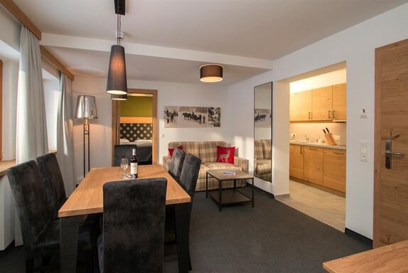 Apartment Alpenheimat De Luxe mit ca. 70 m²: 2 Schlafzimmer mit Doppelbett; voll ausgestattete Wohnküche mit Essecke, Flatscreen-TV, Schlafcouch für 2 Personen, Illy Kaffeemaschine, Geschirrspüler, Cerankochfeld uvm.; 2 Badezimmer mit Badewanne oder Dusche und WC; Balkon oder Terrasse.