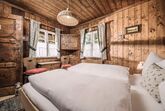 Diese Berghütte am Pillberg vereint den Luxus modernen Wohnens mit traditionellen Elementen. Der großzügige Eingangsbereich bietet ausreichend Platz für die Garderobe und führt euch weiter ins Innere. Hier findet ihr das gemütliche Schlafzimmer mit Doppelbett, TV und viel Stauraum.