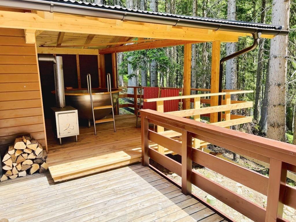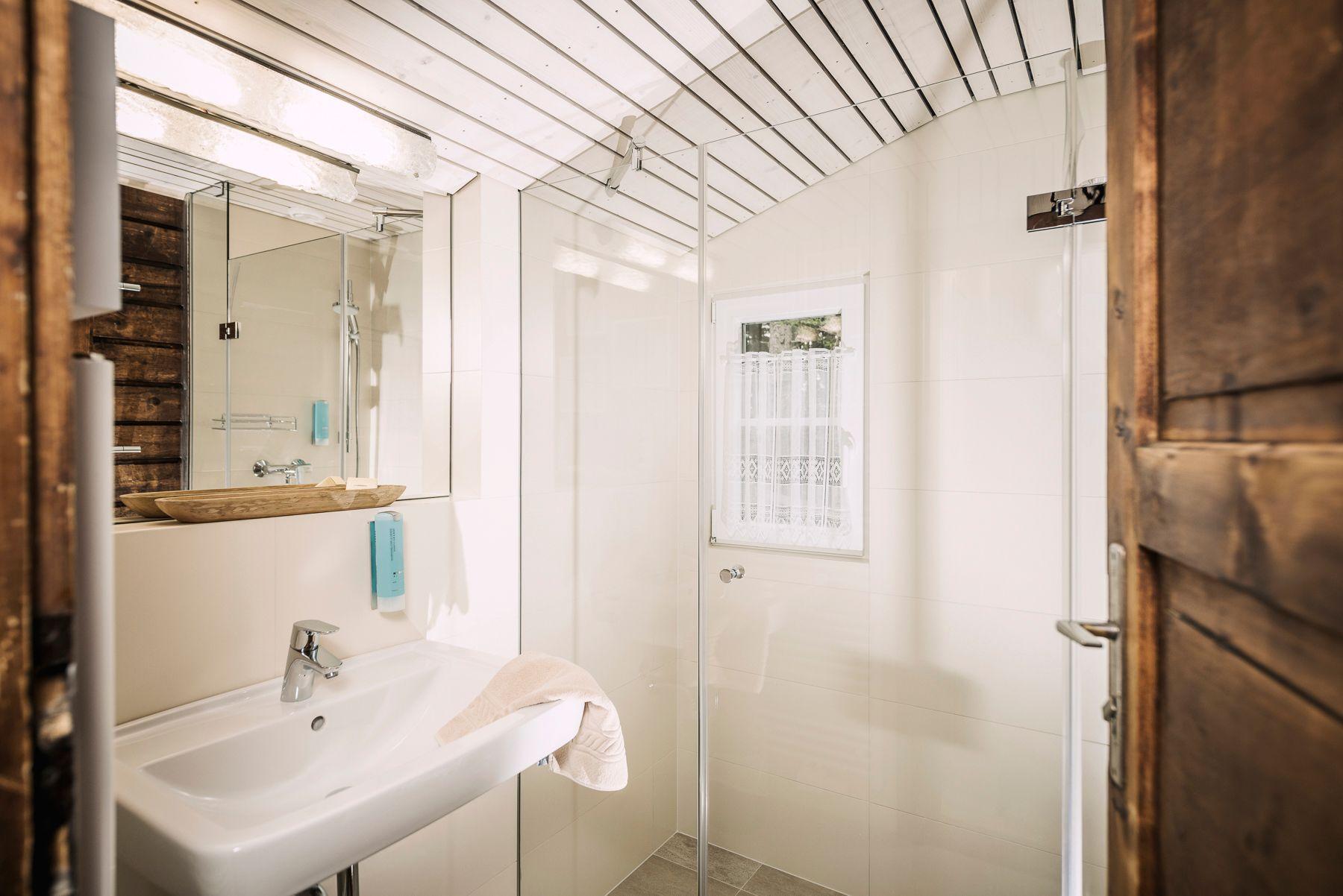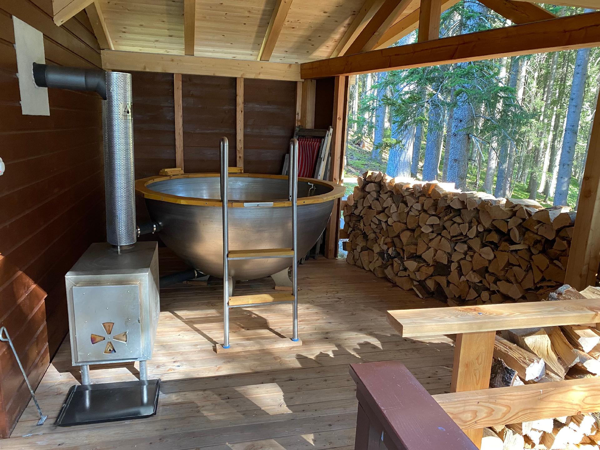 Ein separates Badezimmer mit Dusche und WC. Und nebenan die bestens ausgestattete Küche, die keine Wünsche offen lässt. Integriert in die moderne Küche ist noch ein traditioneller Holzofen, der für eine behagliche Wärme sorgt. Der Holzherd kann nicht nur zum Kochen verwendet werden, sondern beheizt auch das gesamte Haus, sodass stets eine warme und gemütliche Atmosphäre herrscht. Sollte das Feuer einmal erlöschen, schaltet sich automatisch die Gasheizung ein, damit ihr euch jederzeit an einem angenehmen Raumklima erfreuen könnt. Der Essbereich ist perfekt, um gemeinsame Mahlzeiten einzunehmen und schöne Momente miteinander zu teilen. Durch die Küche gelangt ihr auf die große Terrasse. Hier beeindruckt der überdachte Hot-Pot und der kleine Wellnessbereich mit Liegestühlen. Der Hot-Pot eignet sich auch perfekt als Kaltwasserbecken nach dem Saunagang.