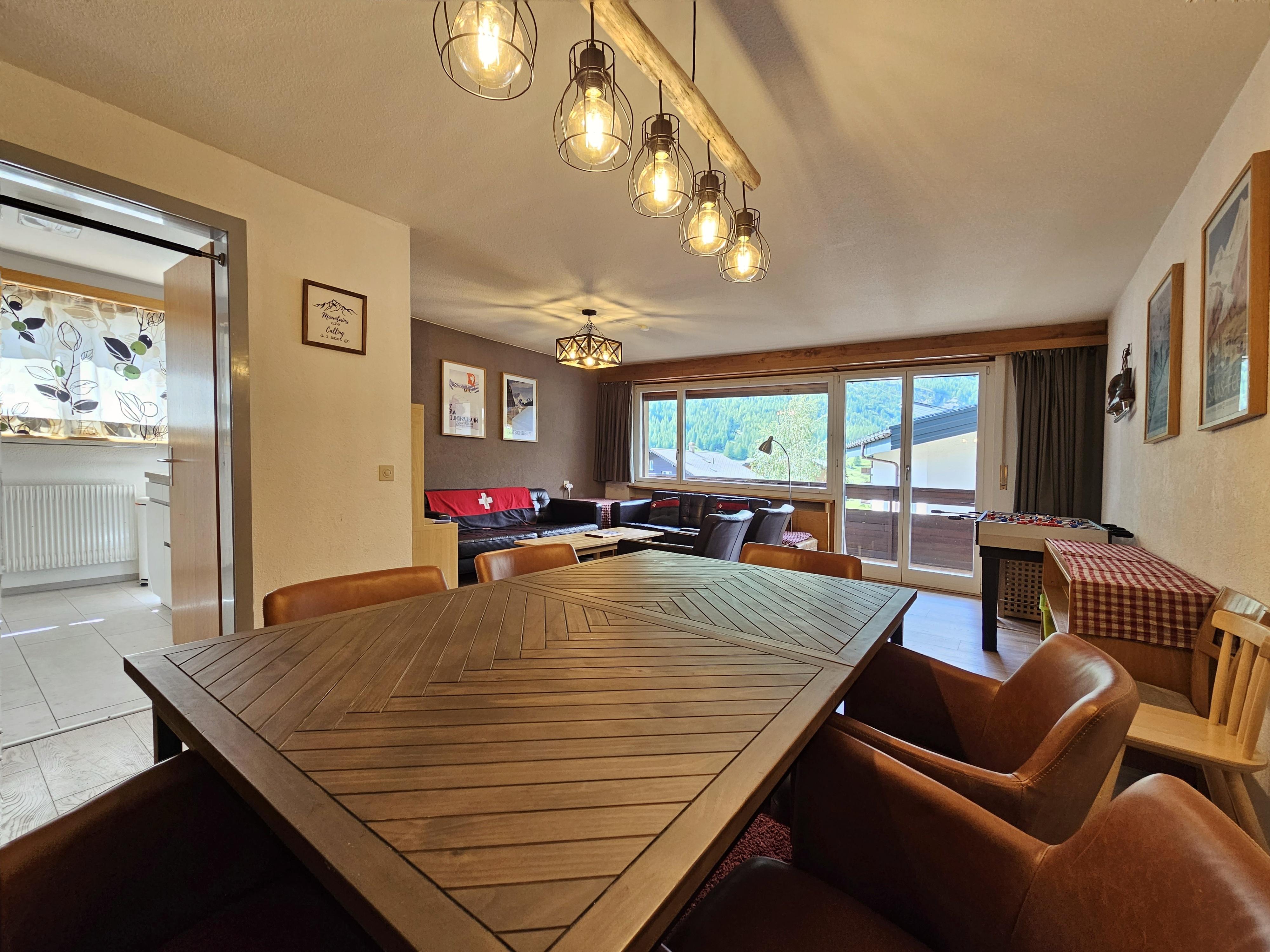 Apartment mit 2 Schlafzimmern im Haus Cresta. Beide Schlafzimmer (eines mit einem Doppelbett, eines mit 2 Etagenbetten) teilen sich ein Badezimmer mit Dusche und WC. Der grosse Wohn- & Essbereich ist der perfekte Ort für die Familie zum Entspannen. Die Küche wurde im Herbst 2020 komplett renoviert. Das Apartment verfügt über einen Balkon mit schöner Aussicht. Von der Küche hat man ebenfalls einen Ausgang zum Balkon. Skiraum und kostenloses WIFI sind vorhanden.