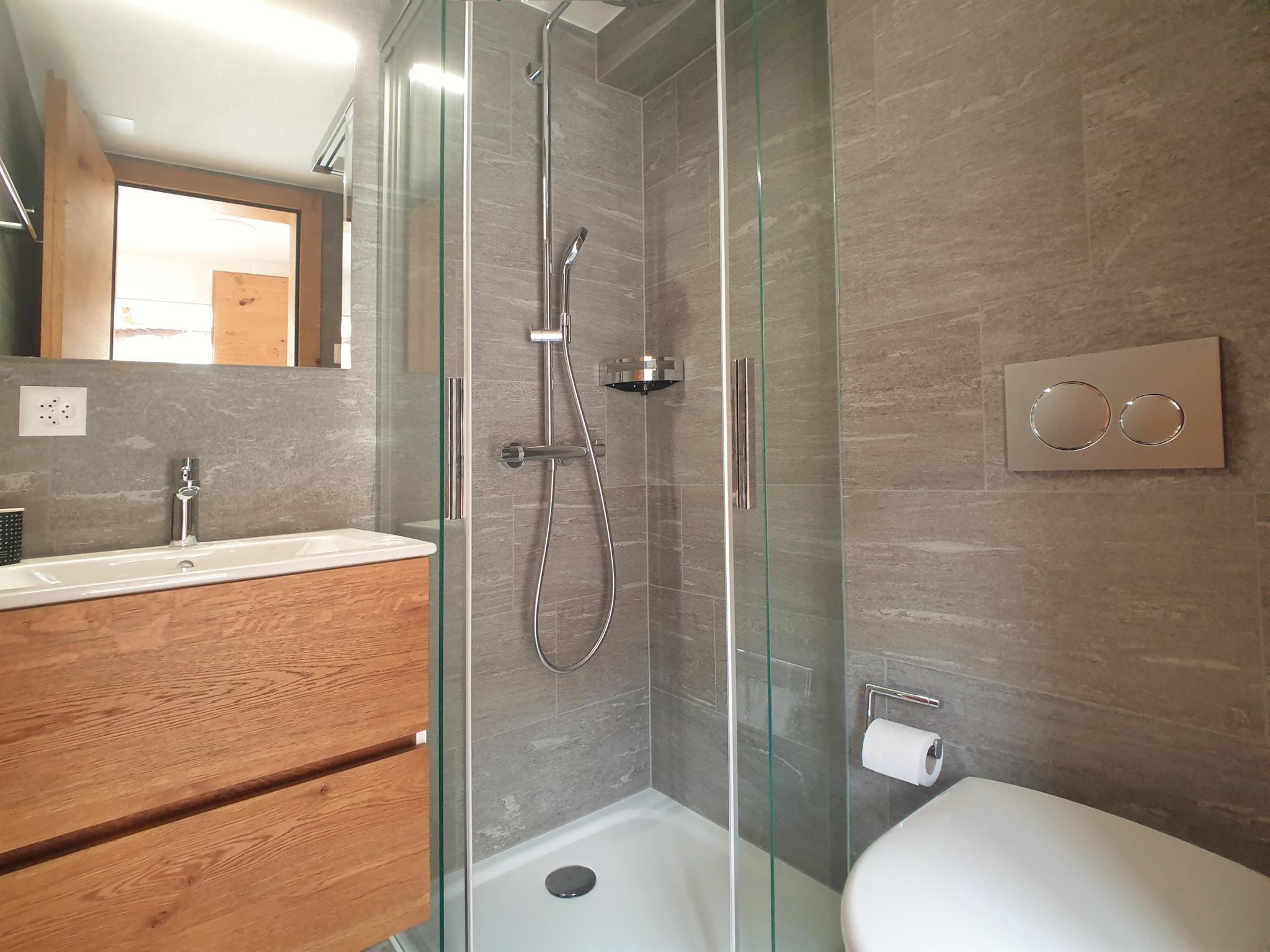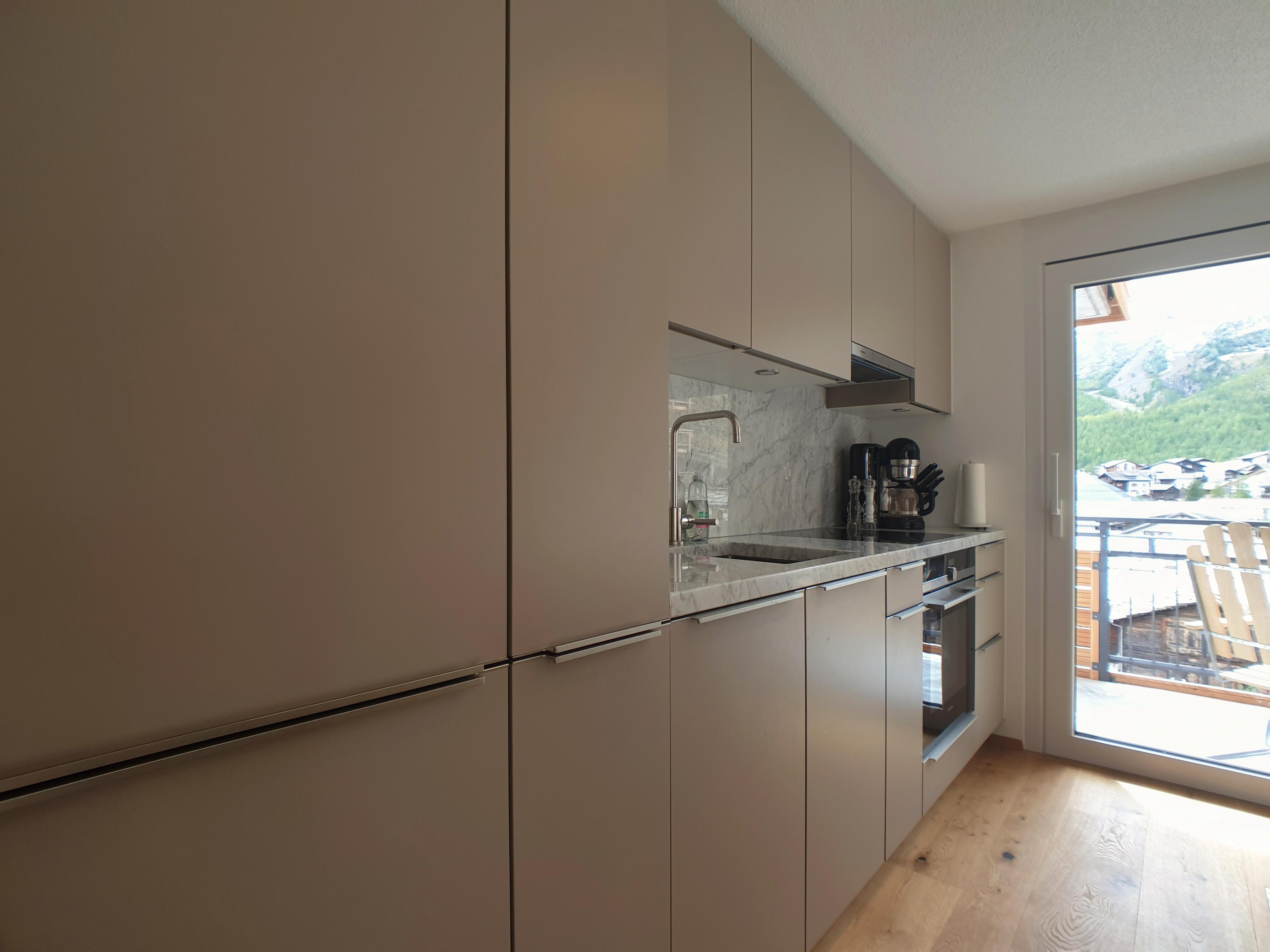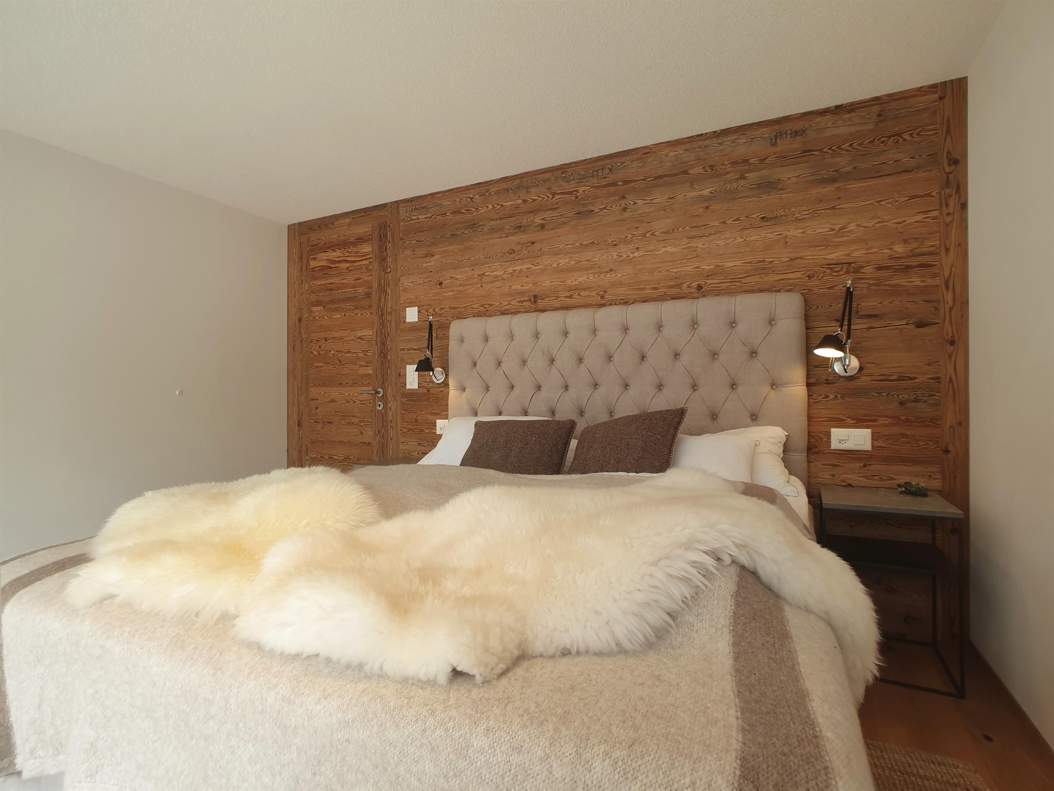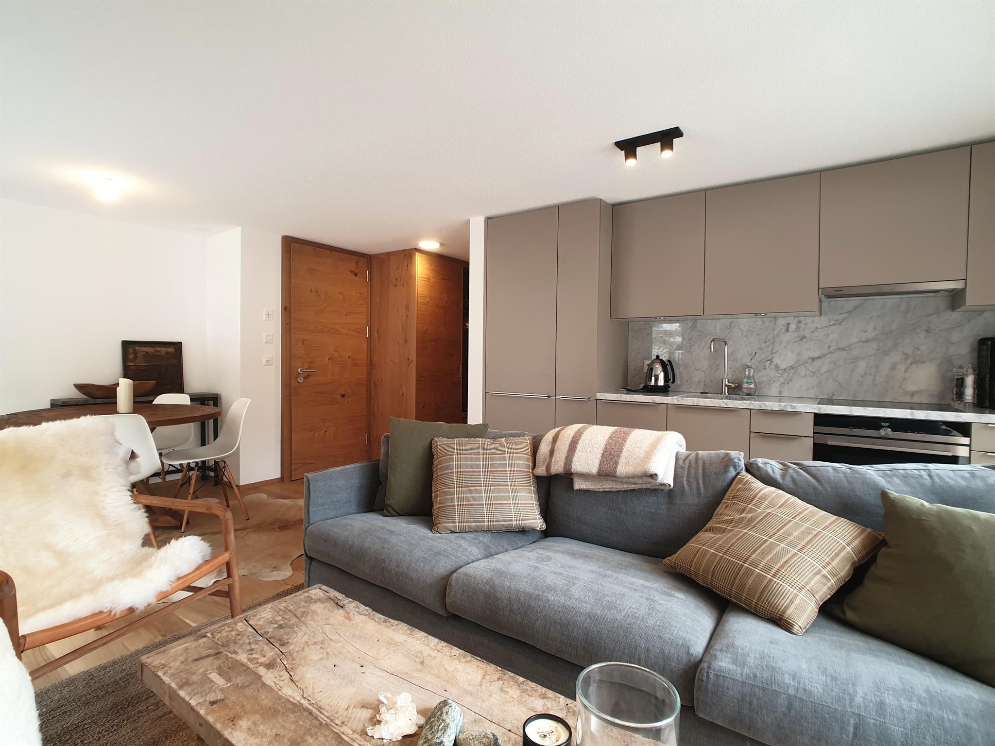 Im Sommer 2020 fertiggestellt befinden sich im Apartment Britannia 2 Schlafzimmer. 1 Schlafzimmer hat ein Doppelbett, das Zweite ist mit 2 Einzelbetten ausgestattet. Alle Betten sind komfortable Boxspringbetten. Beide Schlafzimmer verfügen über ein en-suite Badezimmer. Im Wohnzimmer befinden sich hochwertige Möbel und die offene und moderne Küche. Auch hat das Apartment einen privaten Waschturm. Highlight ist die riesengrosse Terrasse mit genialem Blick über Dorf und Berge.