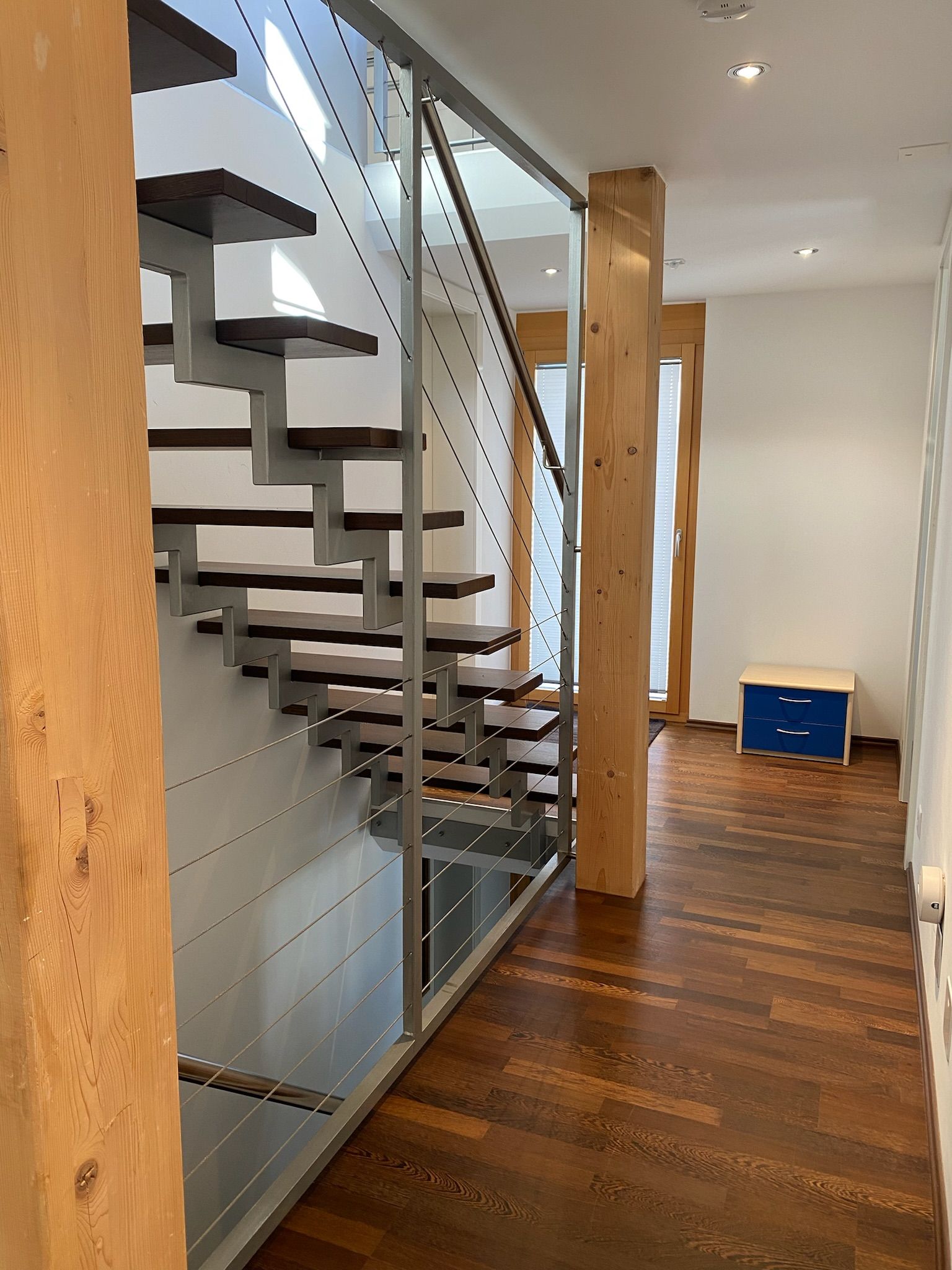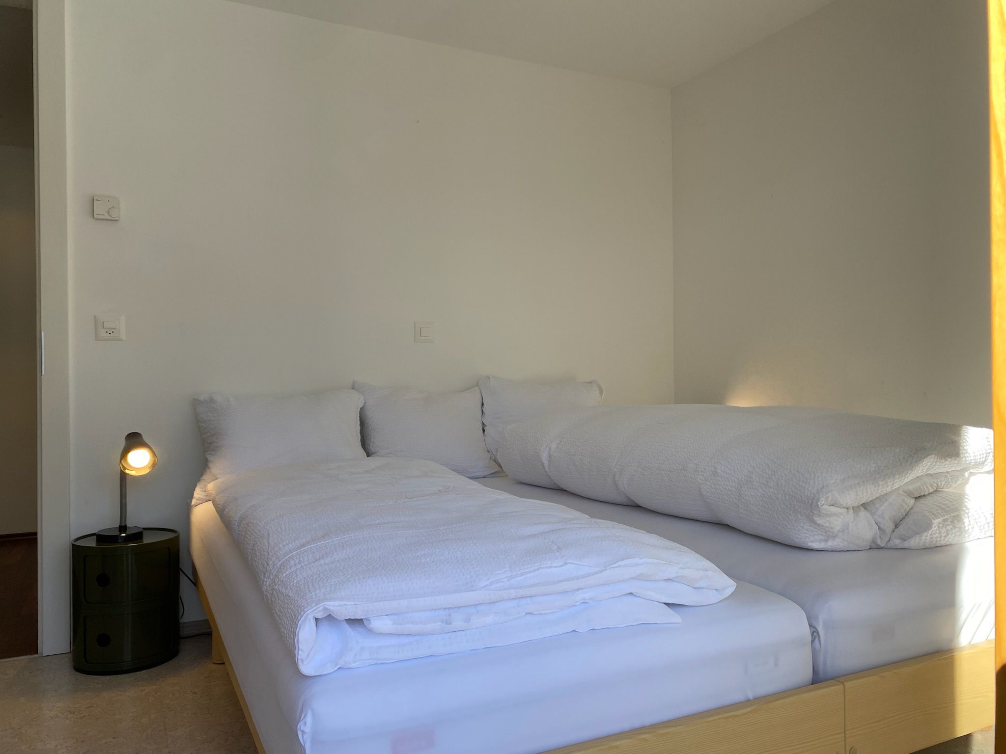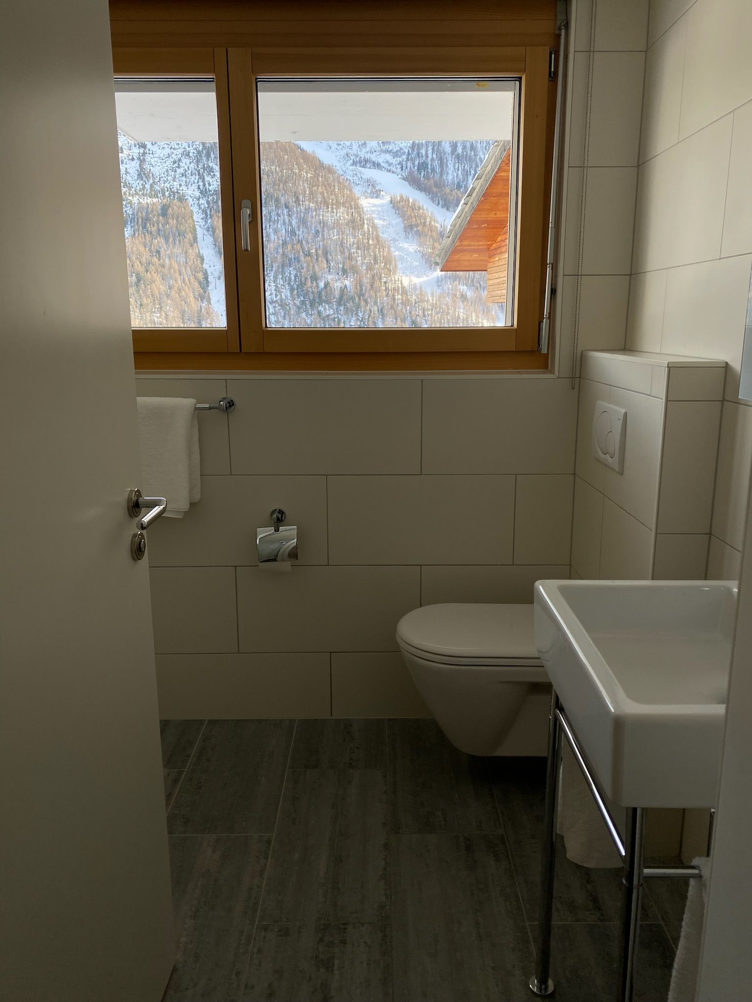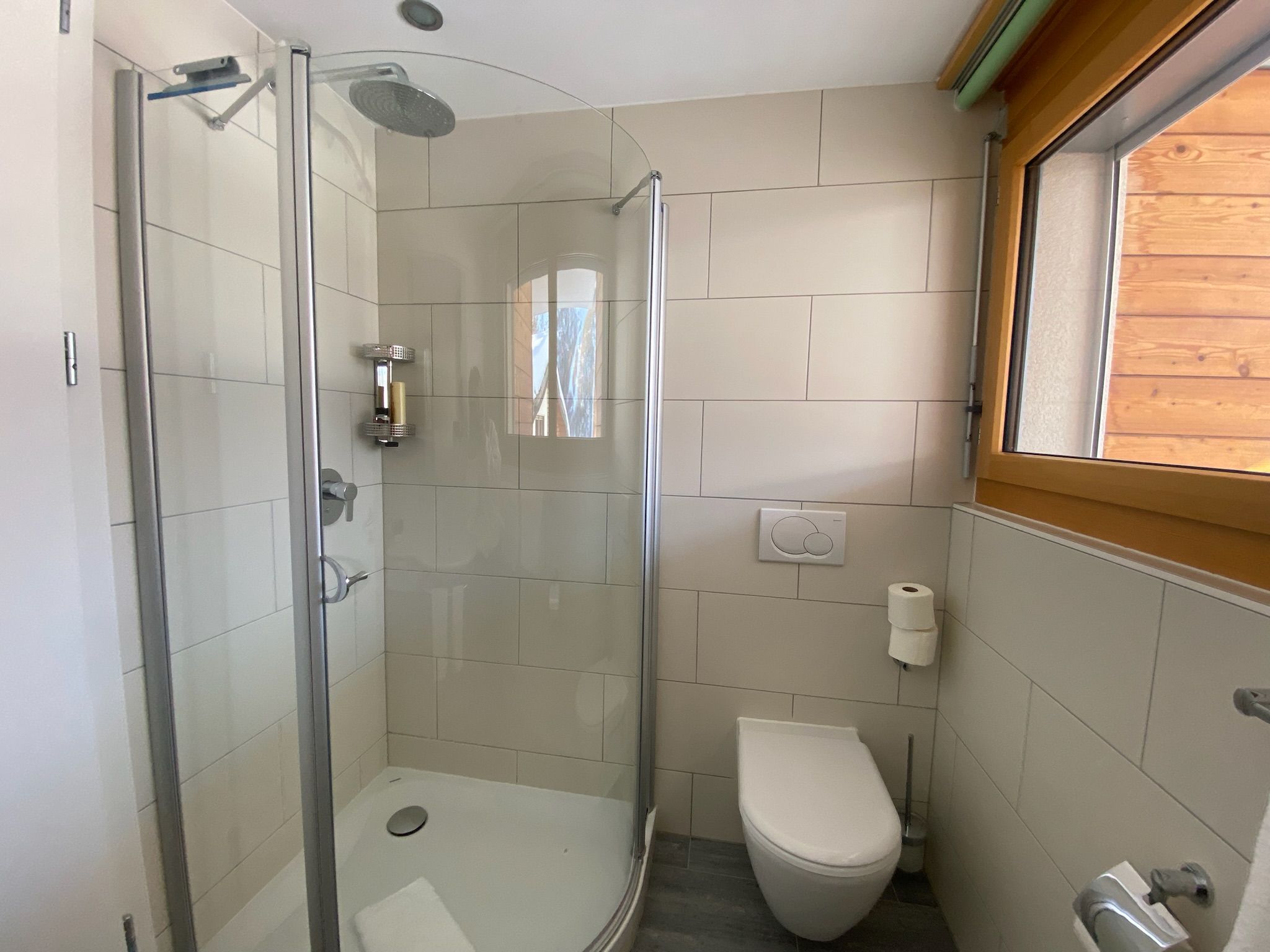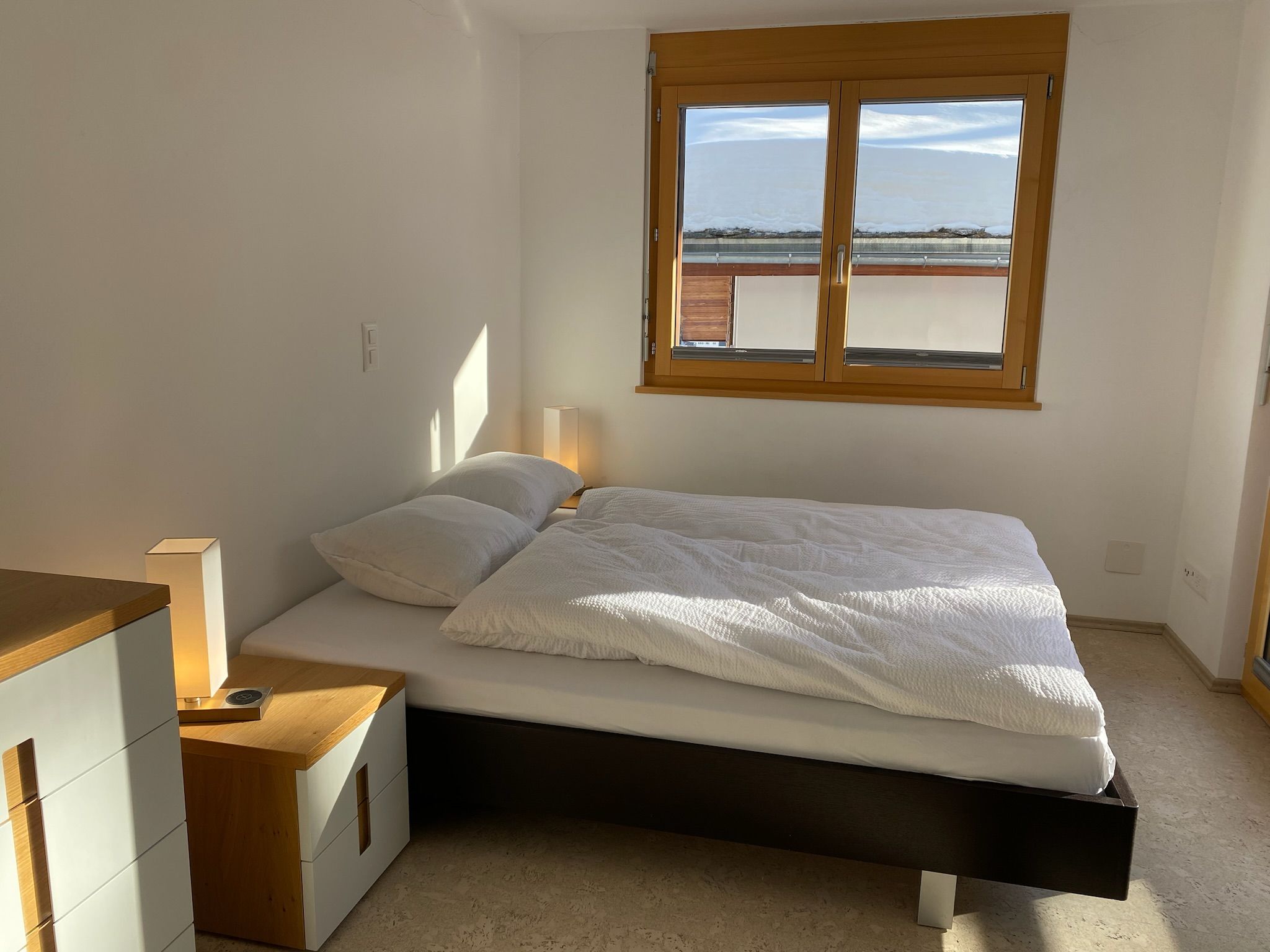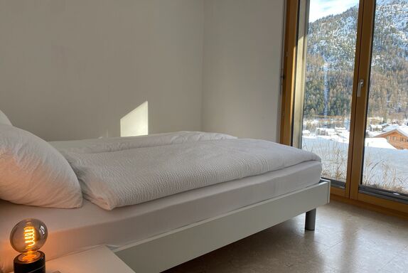 Einen Stock weiter unten hat es ein Schlafzimmer mit einem Doppelbett, Kleiderschrank, Kommode, Zugang zum Balkon und einem Bad mit Wellness-Dusche. Es hat auch ein weiteres Schlafzimmer mit Doppelbett, Zugang zum Balkon und einem Kleiderschrank. Ausserdem hat es noch ein Badezimmer auf dem Stock und den Skiraum.