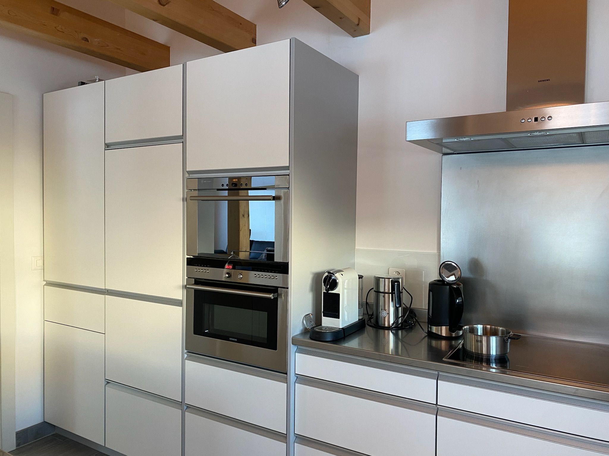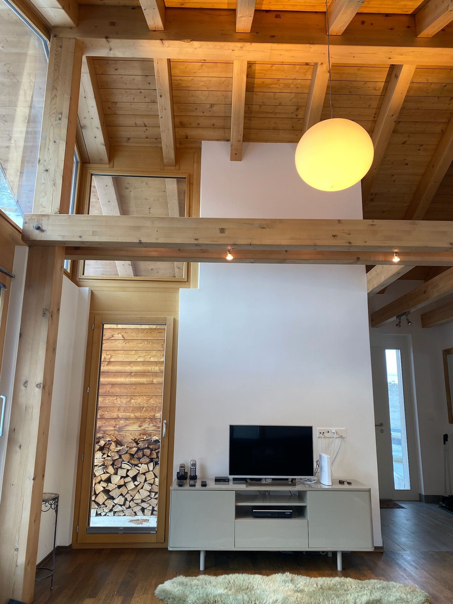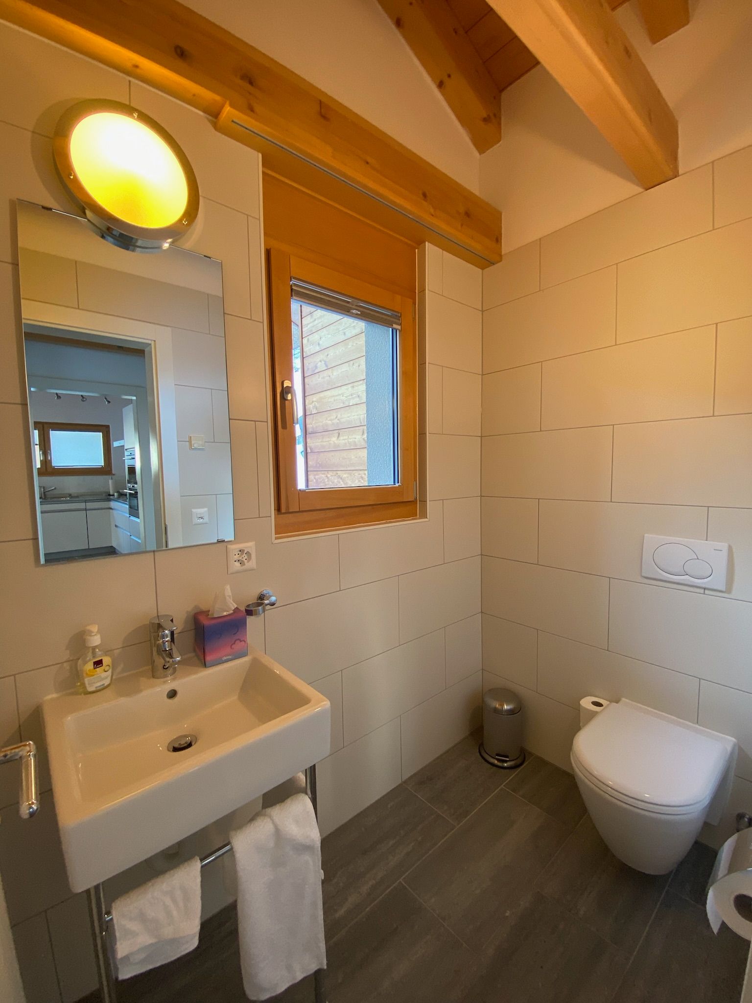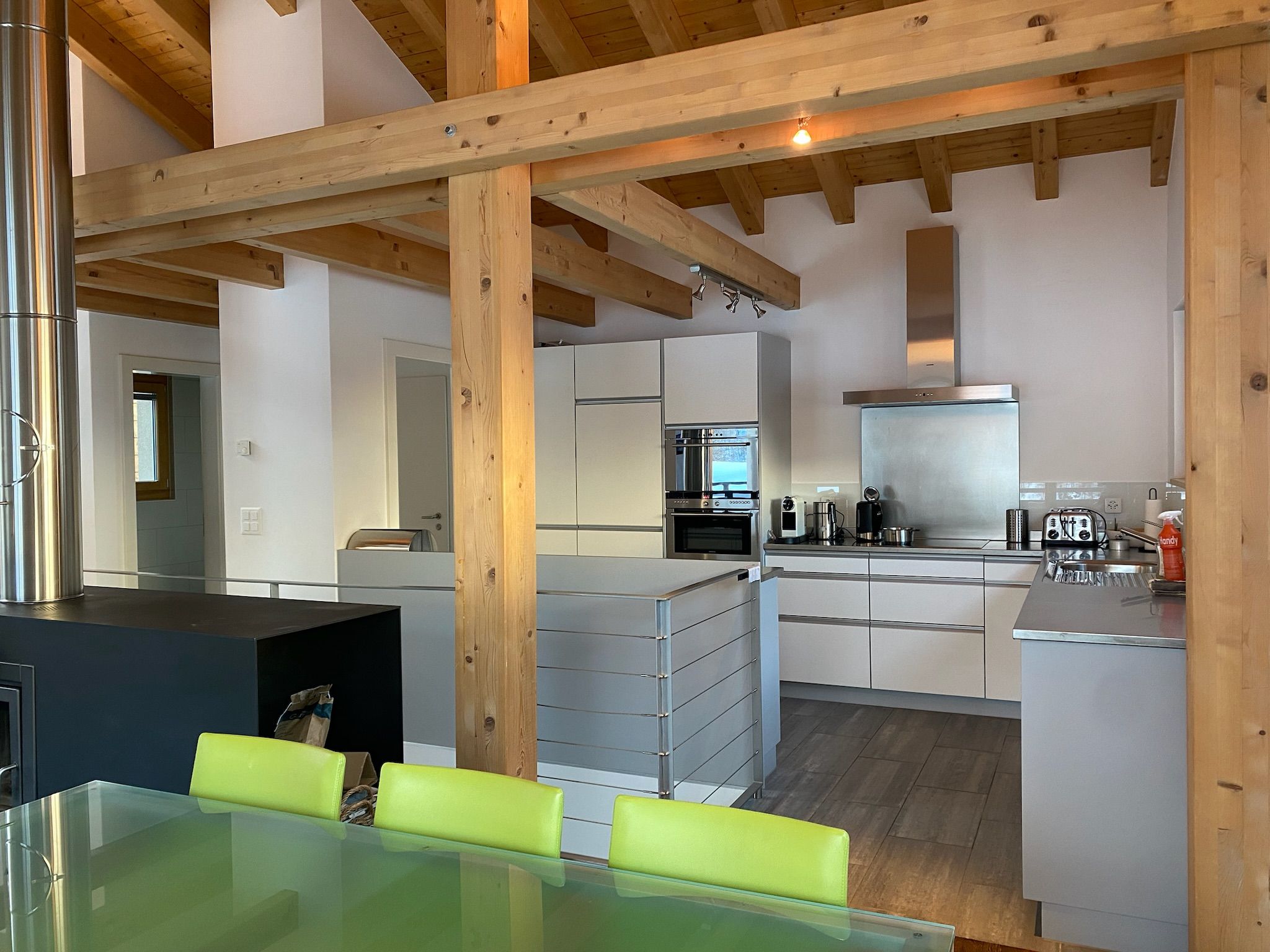 Man betritt das Chalet im obersten Stock, dem Wohnbereich. Hier befindet sich eine Toilette, ein grosses Sofa & ein Fernseher, der Kamin, ein kleines Tischchen mit Stuhl, der Esstisch mit sechs Stühlen, die grosszügige Küche und ein Balkon. Auf dem Balkon steht ein kleines Tischen, zwei Stühle und zwei zusammenklappbare Stühle. Die Küche verfügt über einen Herd, einen Steamer, einen Mikrowellen-Ofen, einen Wasserkocher, eine Kaffeemaschine, einen Toaster, eine Geschirrspülmaschine, einen Kühlschrank, sowie diverse Utensilien zum kochen.