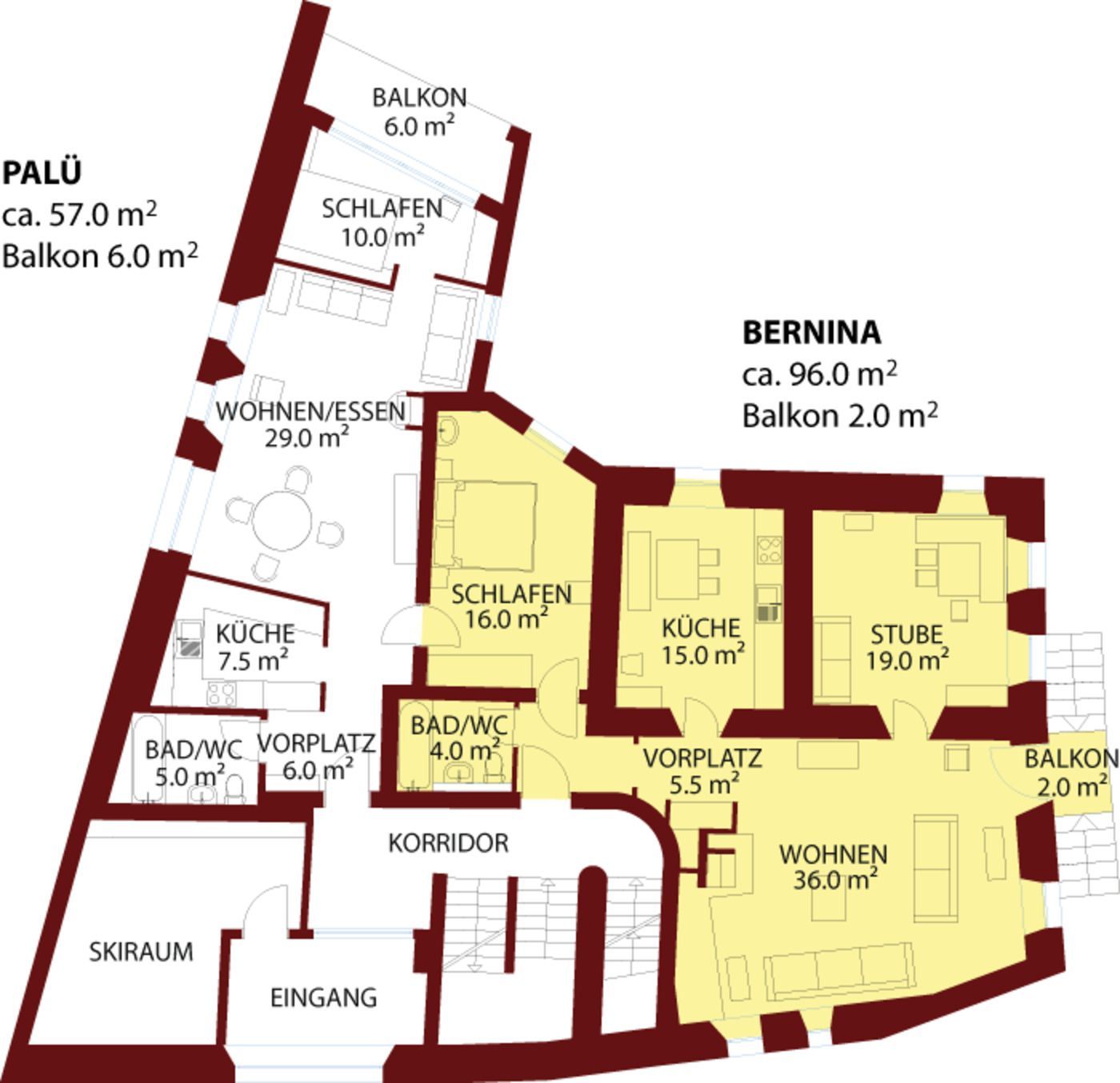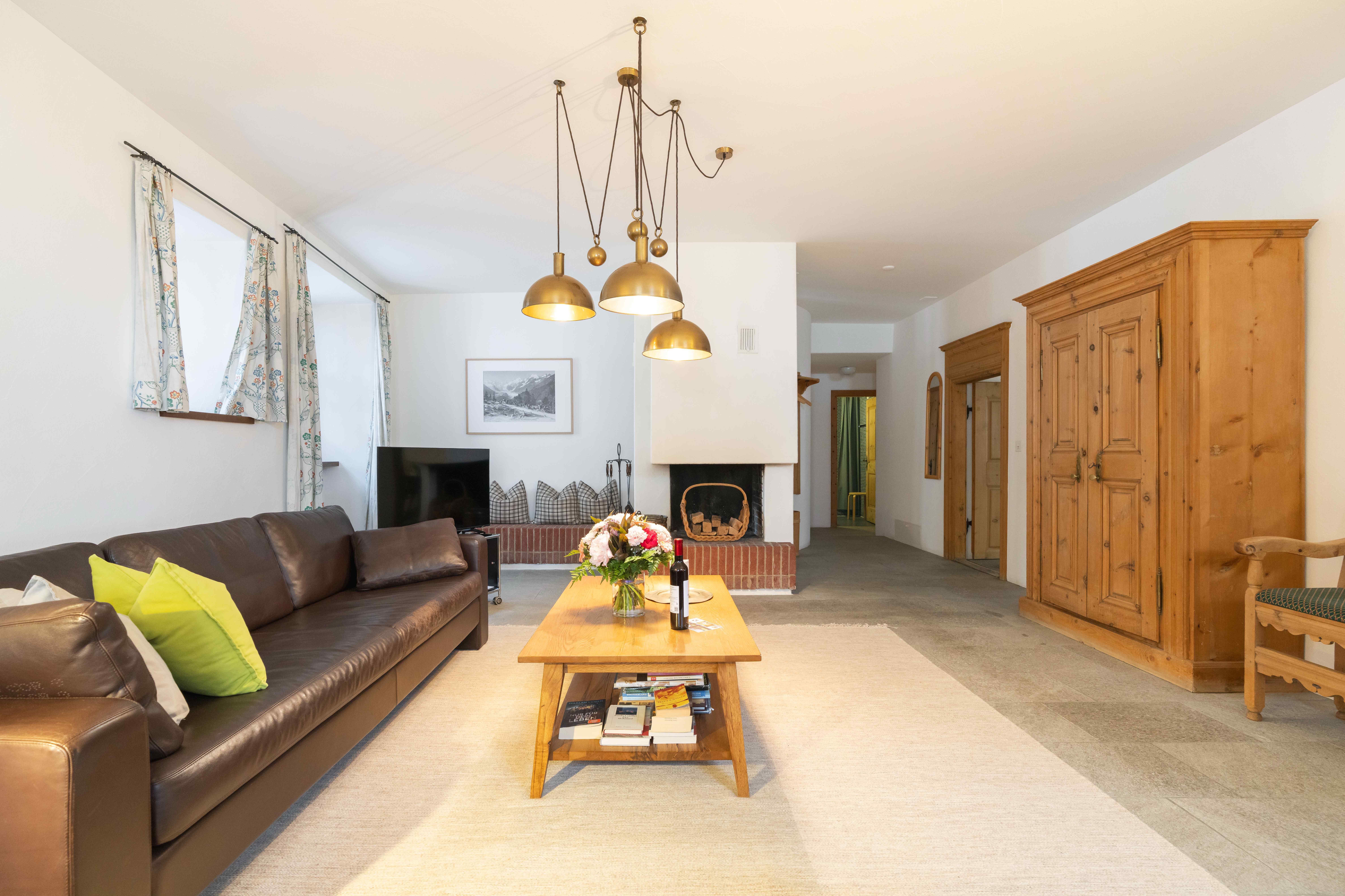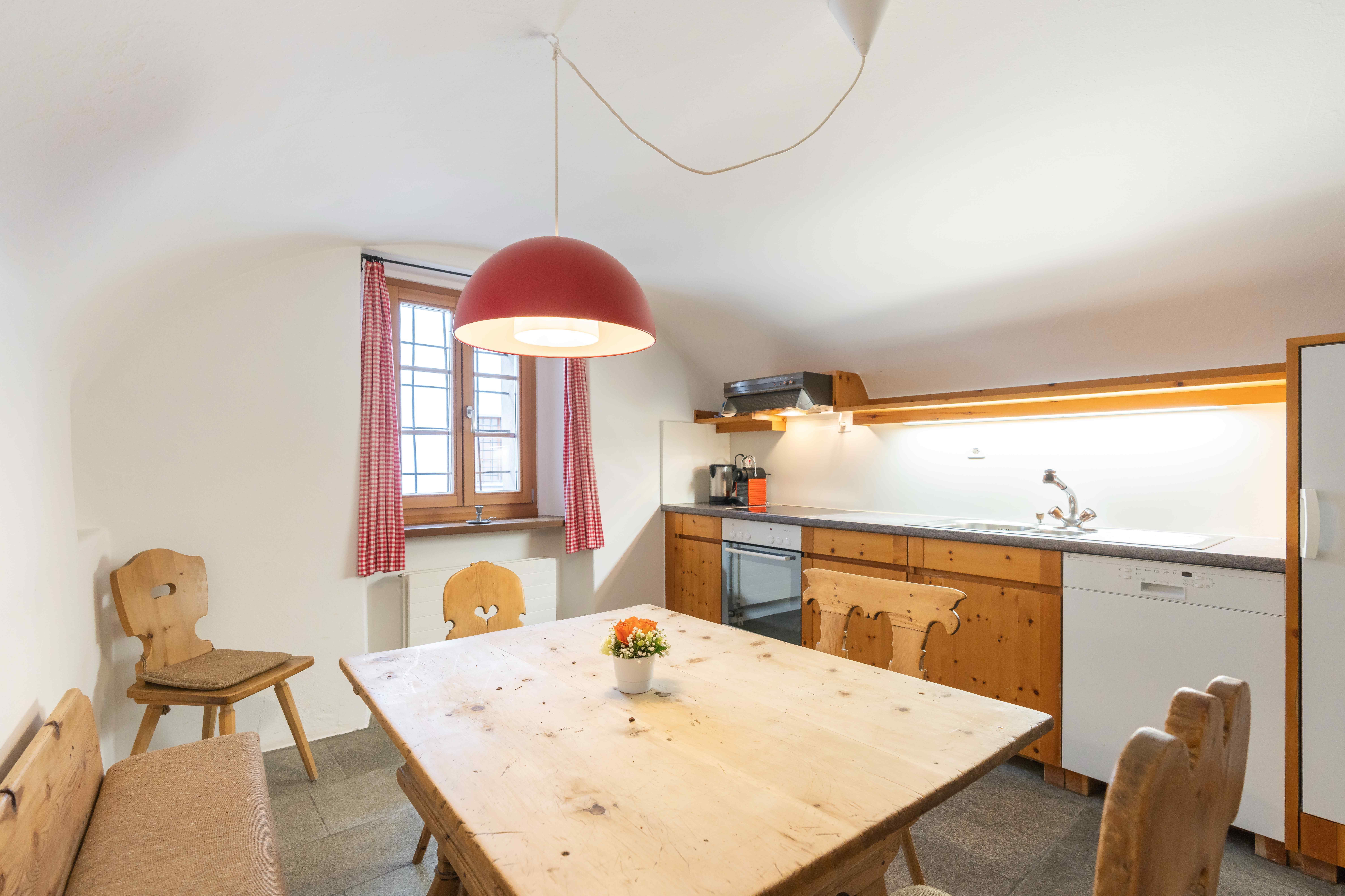 Die 3 ½-Zimmer-Ferienwohnung Bernina bietet mit ihren 96 m² Wohnfläche ideale Bedingungen für bis zu 4 Personen. Sie zeichnet sich durch eine Ausstattung im traditionellen Engadinerstil aus, ergänzt durch liebevoll ausgewählte antike Möbel. Das Highlight ist die stilvolle Wohnküche mit Gewölbedecke, ergänzt durch ein großes Wohnzimmer mit Cheminée für gemütliche Abende, eine urige Engadinerstube, die flexibel als Schlaf- oder Esszimmer genutzt werden kann, ein geräumiges Schlafzimmer mit separatem Lavabo und ein Badezimmer mit Badewanne und Duschvorrichtung. Die Wohnung im Erdgeschoss bietet zudem einen kleinen Balkon mit malerischem Blick auf den Dorfkern und die Kirche.