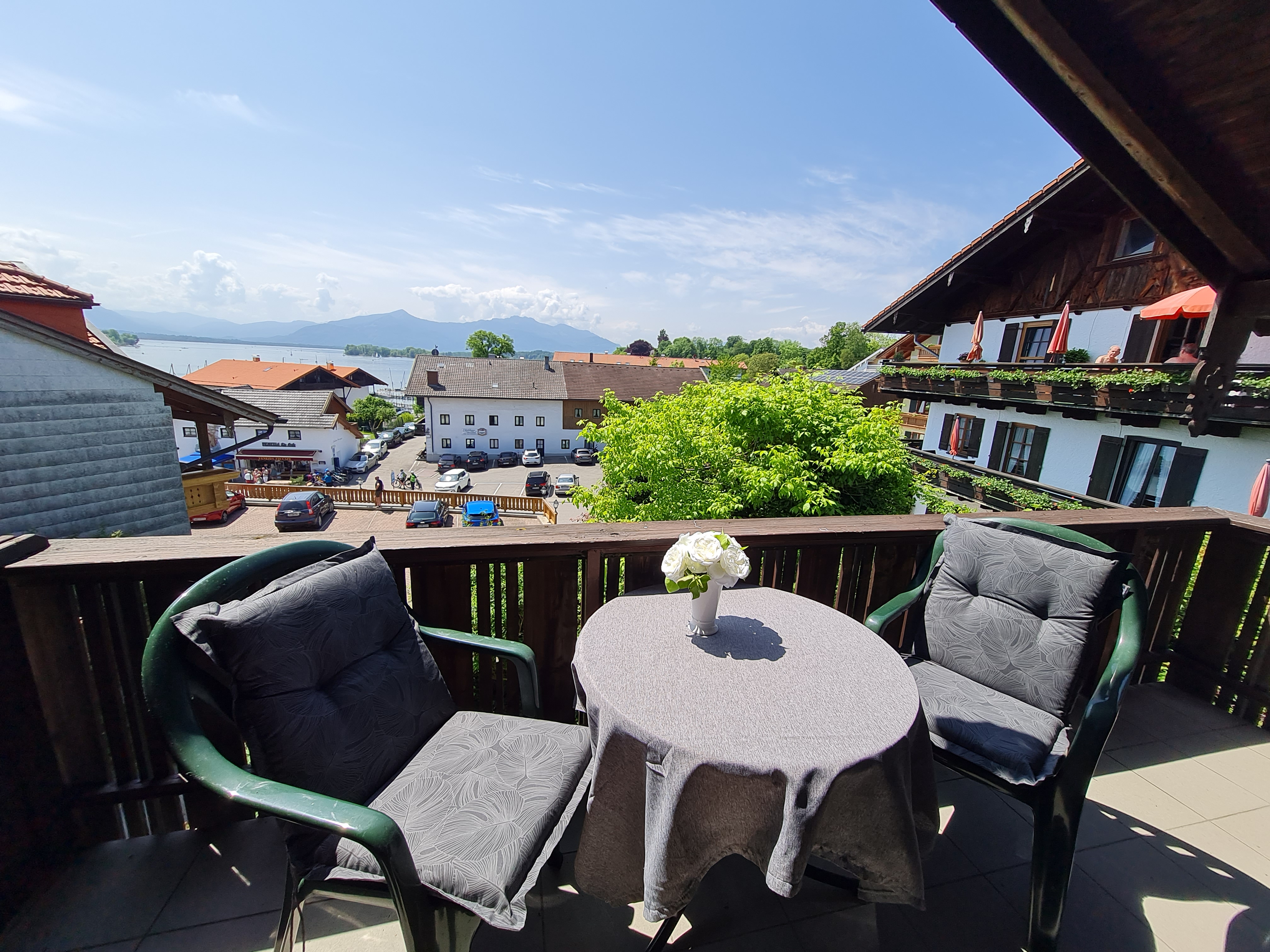 Gemütliches Gästehaus mit Blick auf den See, die Chiemgauer Berge und Inseln. 100 Meter zum See und zur Schiffsanlegestelle. Eigener Badeplatz und Liegewiese mit Bootsverleih (Elektro- Tret- Ruderboote) für Hausgäste ermäßigte Preise. Parkplatz am Haus, Fahrradgarage; Garten am Haus; Kinderbett und Hochstuhl, kleiner Kinderspielplatz.