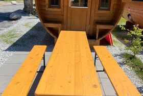 Die komplette und durchdachte Ausstattung mit Strom, Licht und integriertes kleines Infrarot Deckenpanel als Wärmequelle sorgt auch bei schlechtem Wetter für einen behaglichen Aufenthalt im Holzfass. Die großen Fässer beinhalten auch Kühlschrank, Mikrowelle, Wasserkocher und Kaffeemaschine.