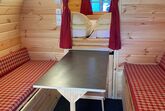 Zum Schlafen befindet sich im hinteren Bereich ein riesiges Bett mit 2 x 2 m, das über 2 Stufen bequem erreichbar ist. Zusätzlich lassen sich die Sitzbänke im Wohnbereich zu weiteren Schlafgelegenheiten (für Kinder) umbauen. Bis zu vier Personen können so bequem in einem Schlaffass übernachten.