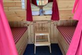 Unter dem Bett lässt sich der große Tisch nach vorne in den Wohnbereich ausziehen. So entsteht mit den gepolsterten Sitzbänken ein gemütliches „Wohnzimmer“ für bis zu 4 Personen.