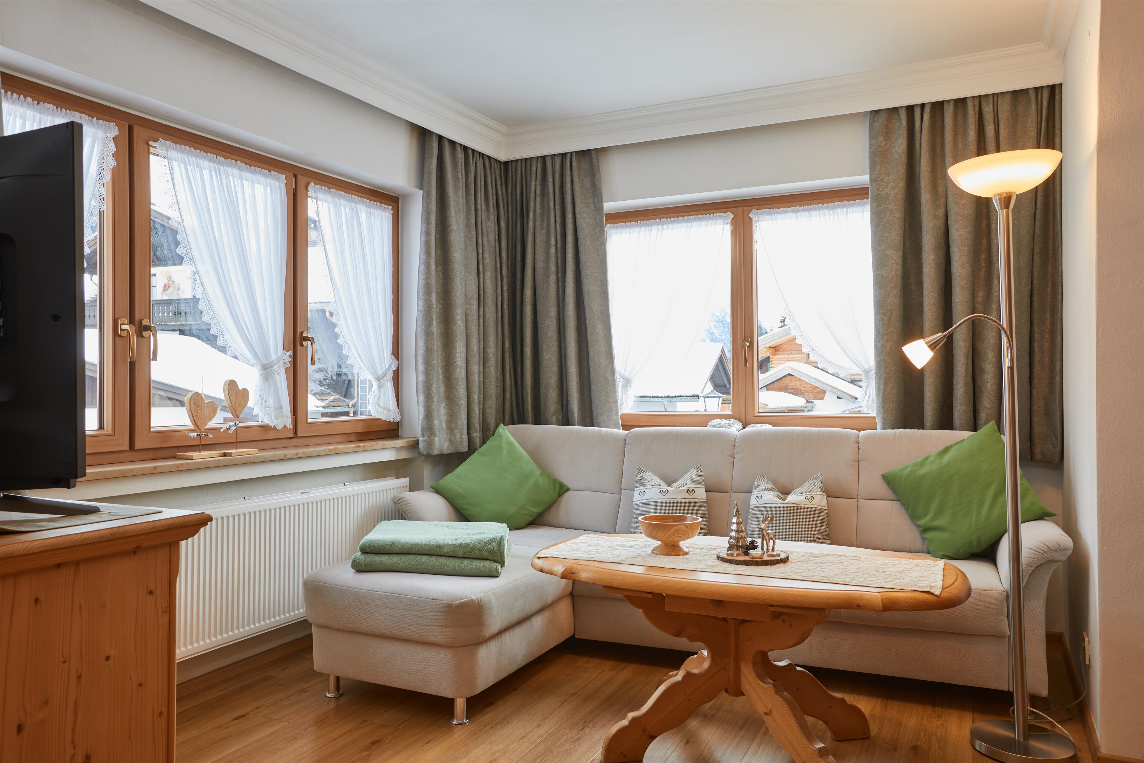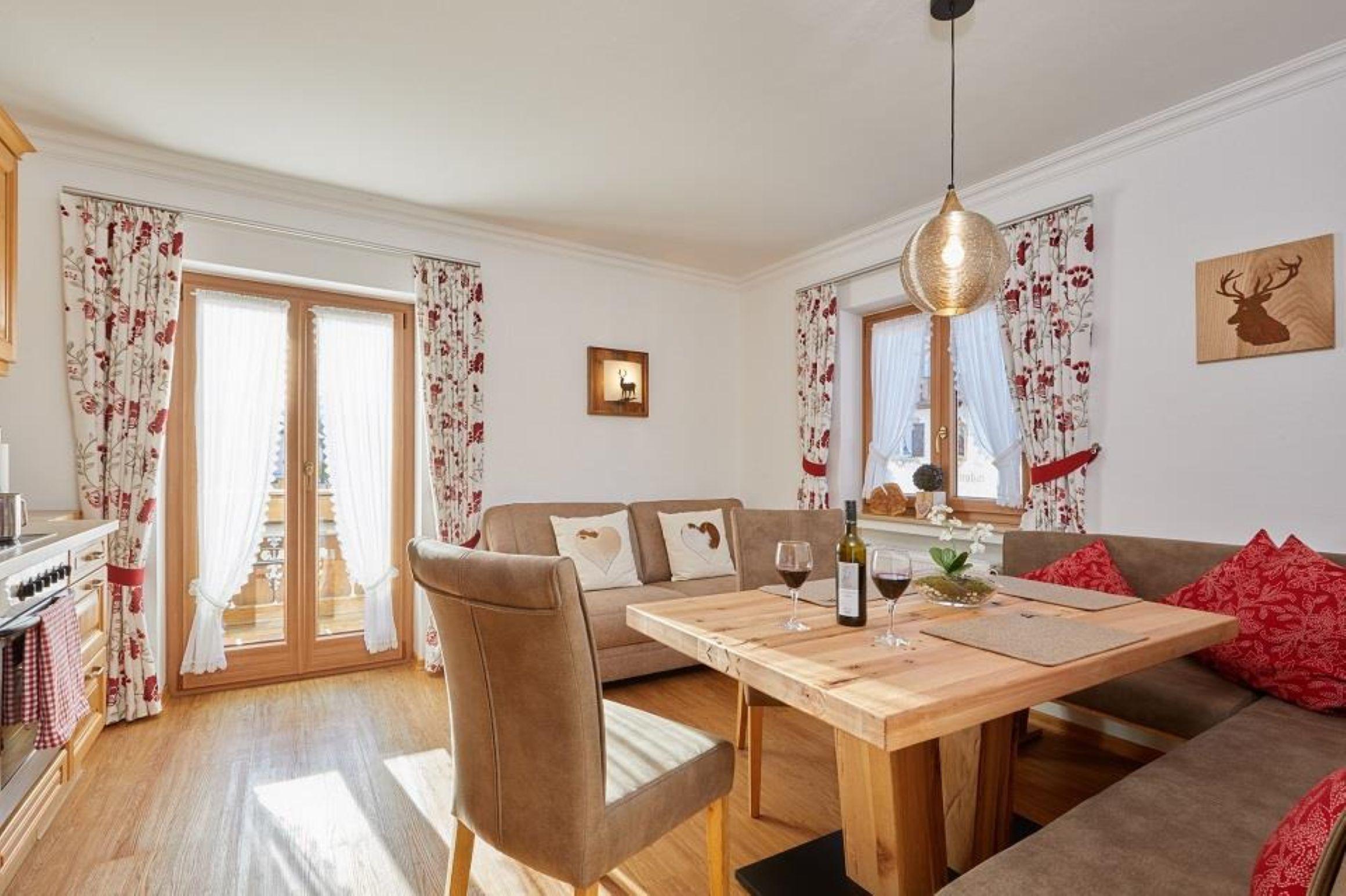 ****Wohnung Rehbock mit 53 qm, 1.Stock mit möblierten Ost- und Südbalkon, Panoramablick auf das Karwendel- und Wettersteingebirge. Hochwertige Ausstattung, Holzvinylboden, Altholzwand, großes Schlafzimmer mit elektr. verstellbaren Boxspringbett (2x2 m) und komfortabler Sitzecke. Wohnküche mit Küchenzeile, Spülmaschine, Backofen mit Ceranfeld, sämtl. elektr. Geräte, gemütlicher Eckbank und Sofa. Dusche/WC mit Regendusche, Handtuchwärmer, LED-Beleuchtung, Kosmetikspiegel und Haarfön. Flachbildschirm, Internetradio, Safe, kostenloser W-LAN Internetzugang.