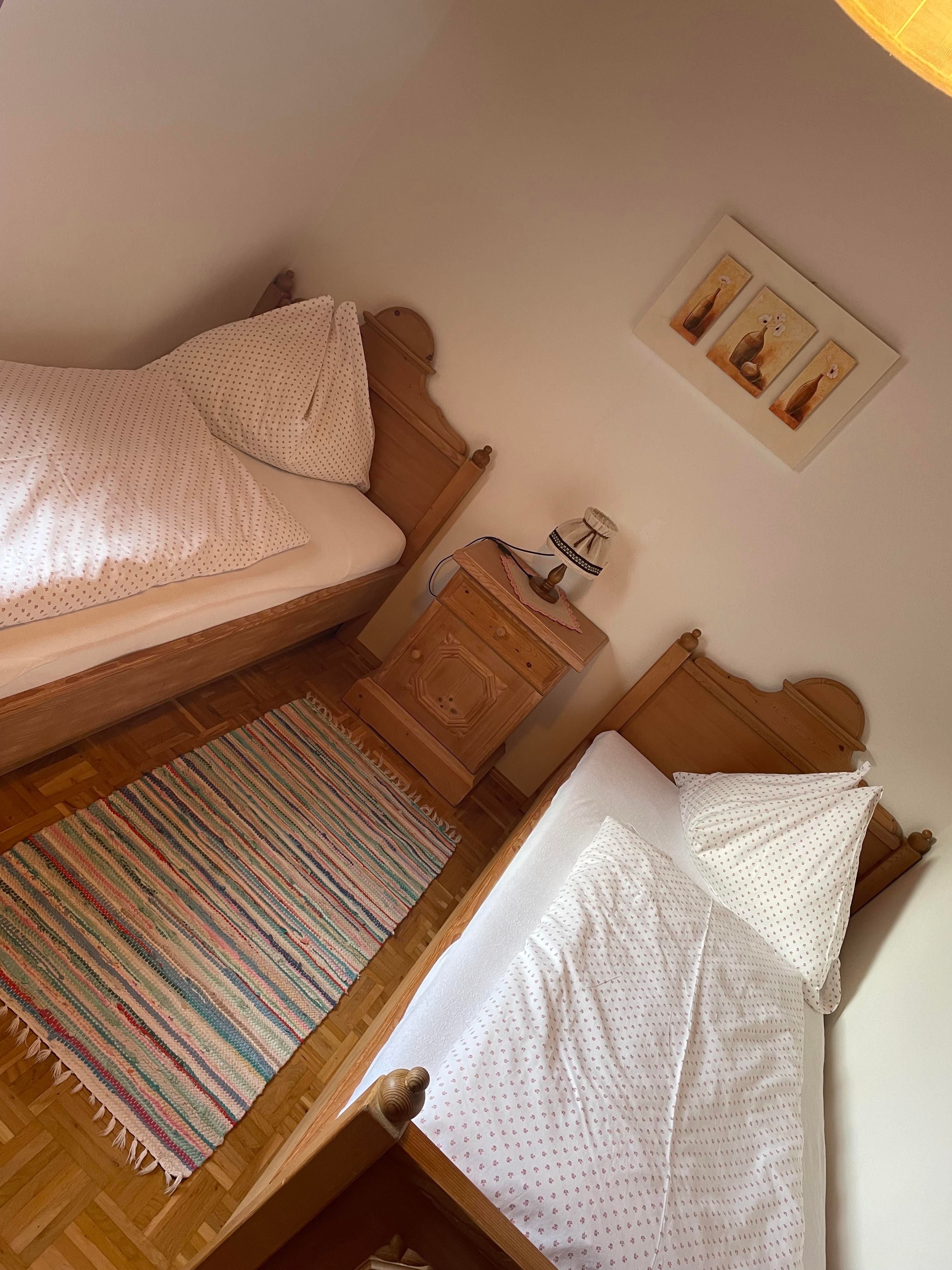 Ferienwohnungen im 1.Stock mit 60m² für 2-4 Personen (auf Anfrage für 5 Personen) bestehend aus 2 getrennten Schlafzimmern, Küche, Wohn- und Esszimmer, Badezimmer und WC seperat, Balkon/Terasse, TV, WiFi und Radio.