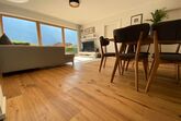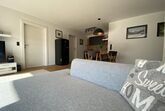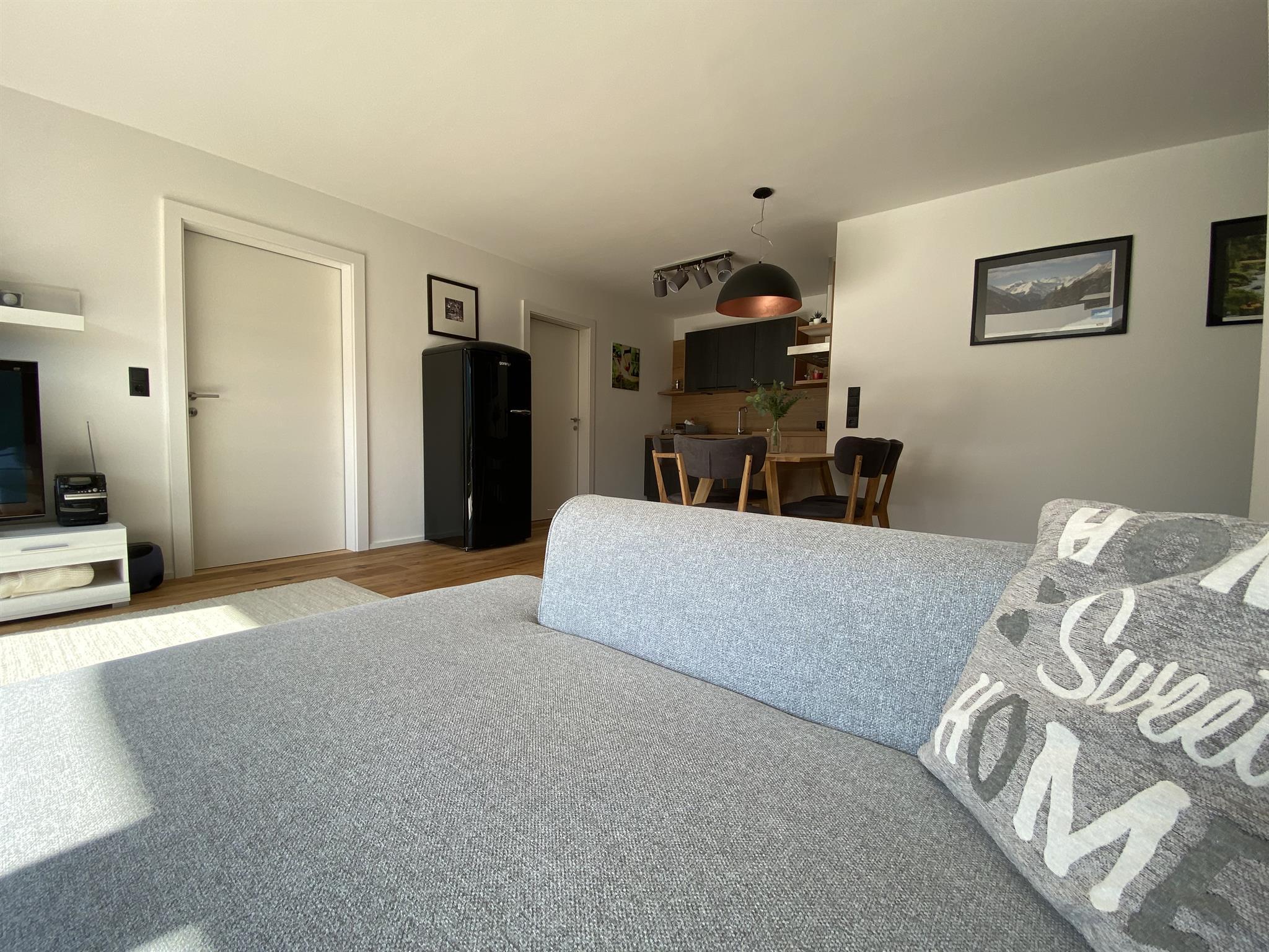 Gesellige Abende verbringen Sie im offenen Wohnzimmer mit Esstisch für bis zu 5 Personen, einer gemütlichen Schlafcouch und einen Flat-TV.
