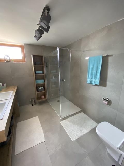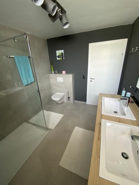 Das Badezimmer ist mit einer großzügigen Dusche mit Regenbrause, WC und Doppelwaschbecken ausgestattet.