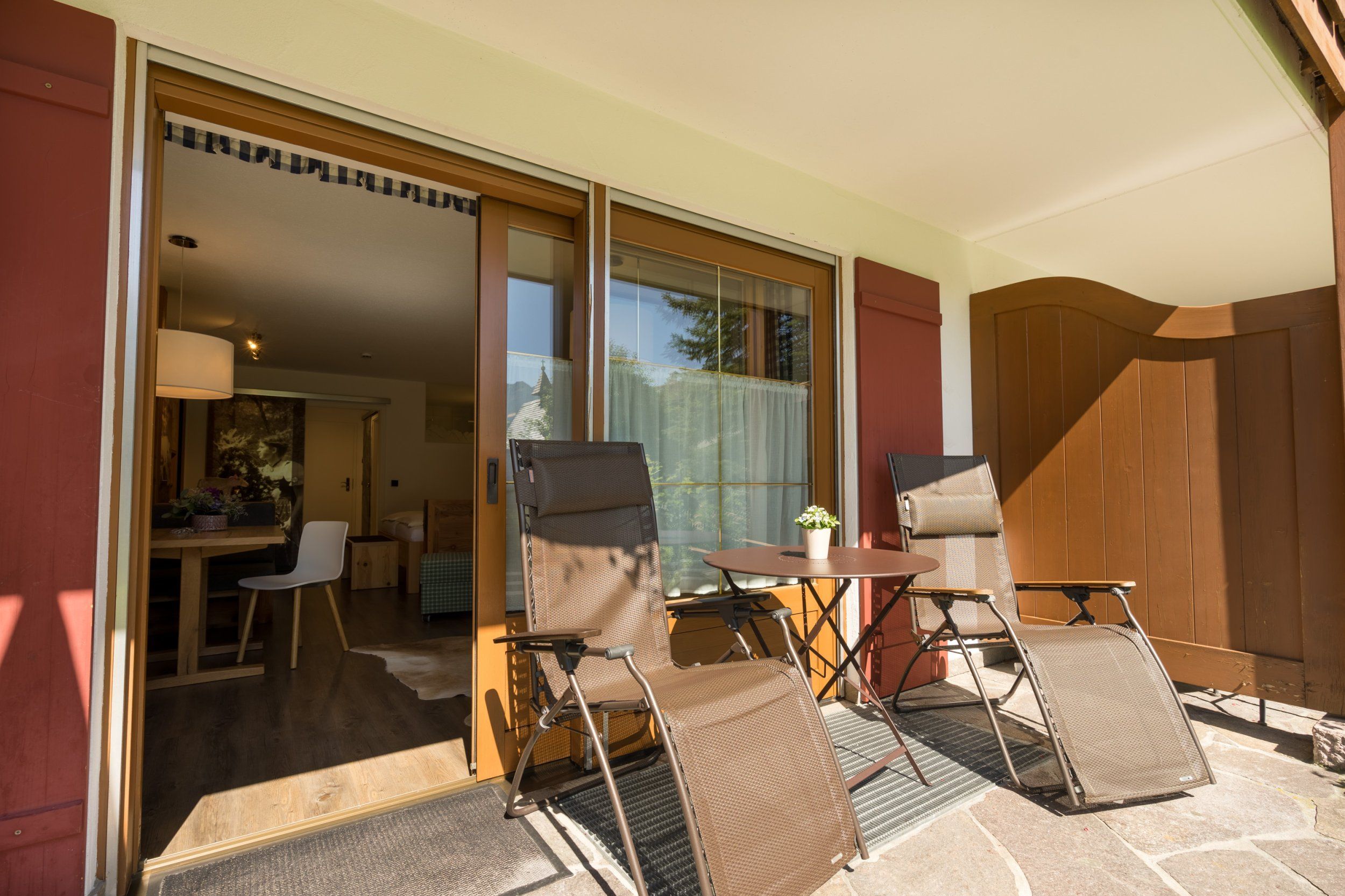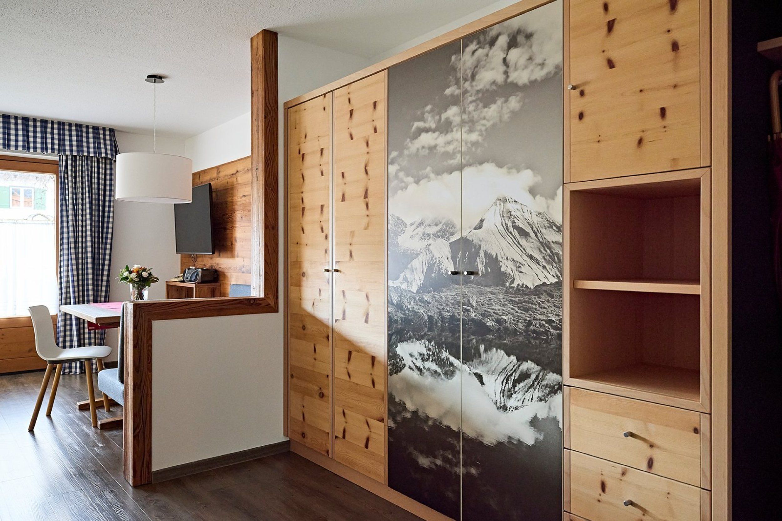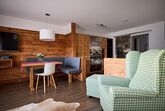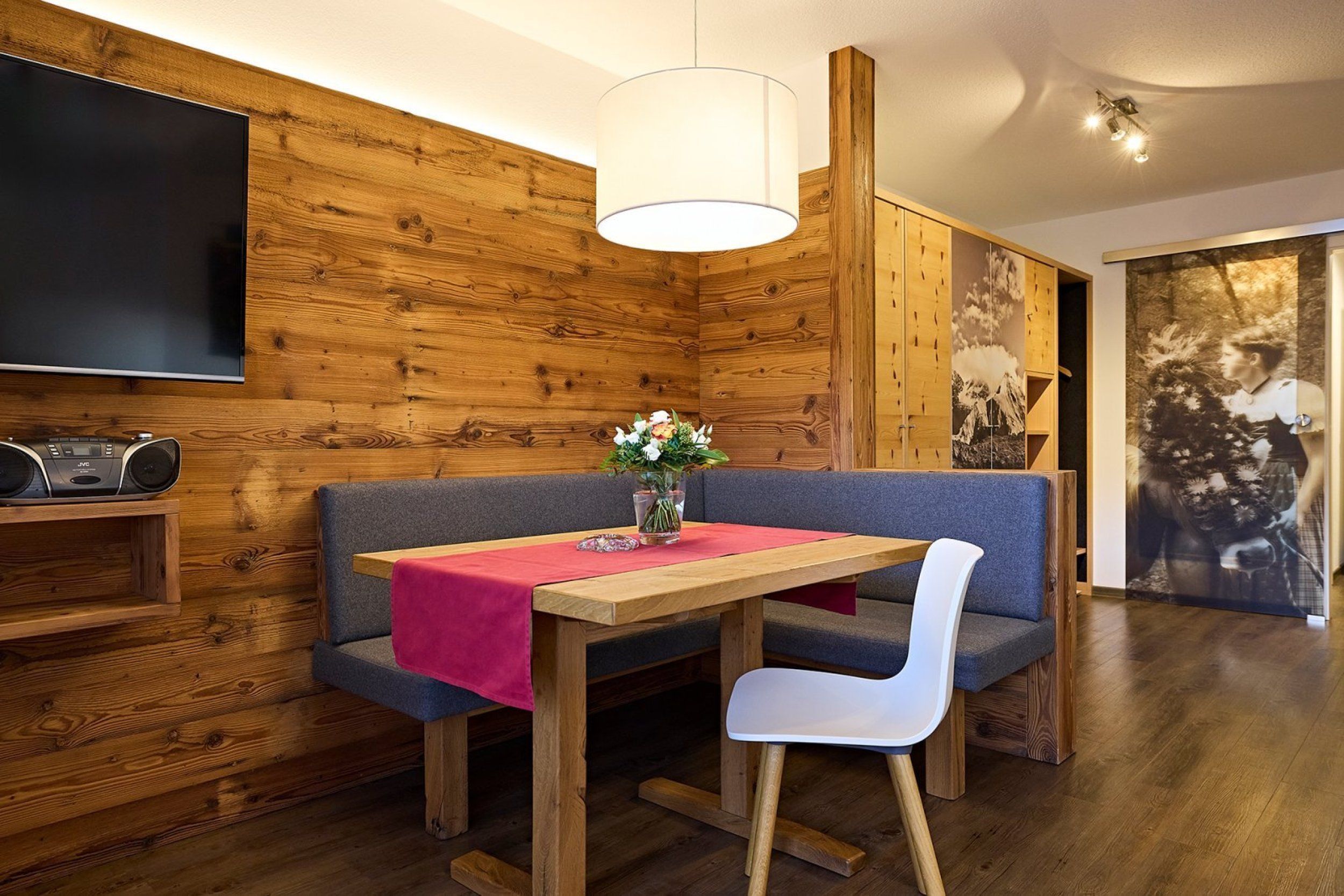 Unsere 1-Zimmer-Ferienwohnung im exklusiven und modernen alpinen Stil mit Zirbelkiefer, heimischem Altholz, edlem Tiroler Lodenstoff und hochwertigen Federkernmatratzen im Schlafbereich sorgen für max. Wohlfühlfaktor.