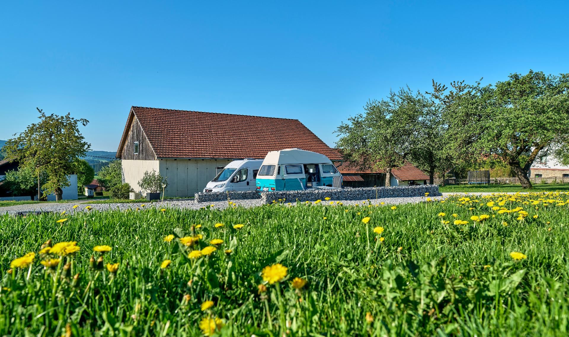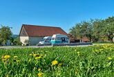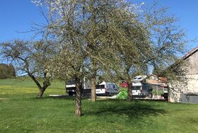 Unsere drei großzügigen Stellplätze (jeweils 10 x 6 m) liegen idyllisch inmitten des Obstgartens unseres Anwesens.