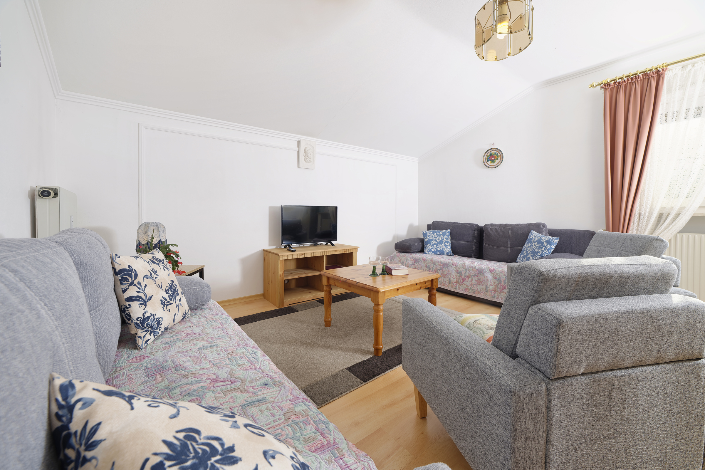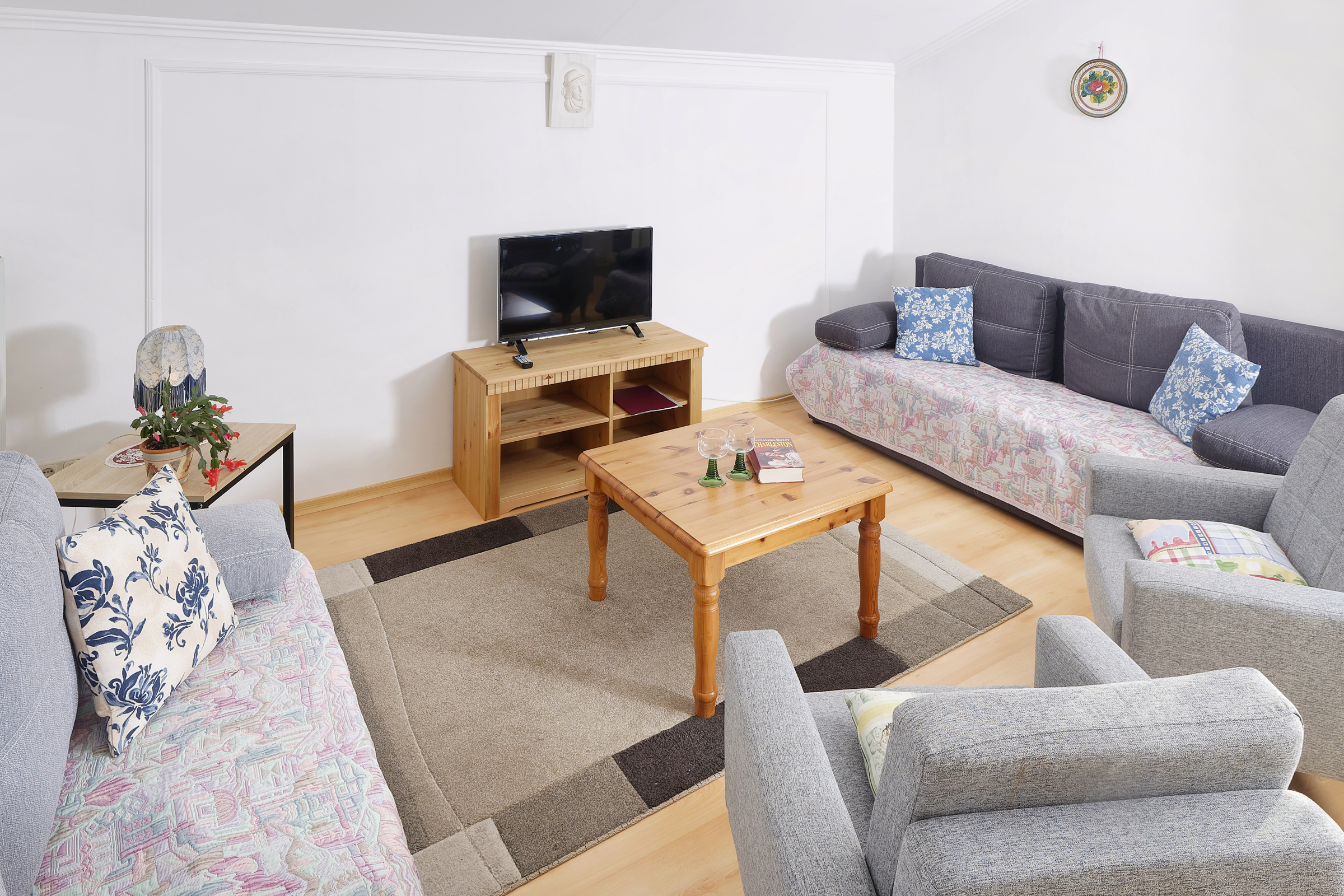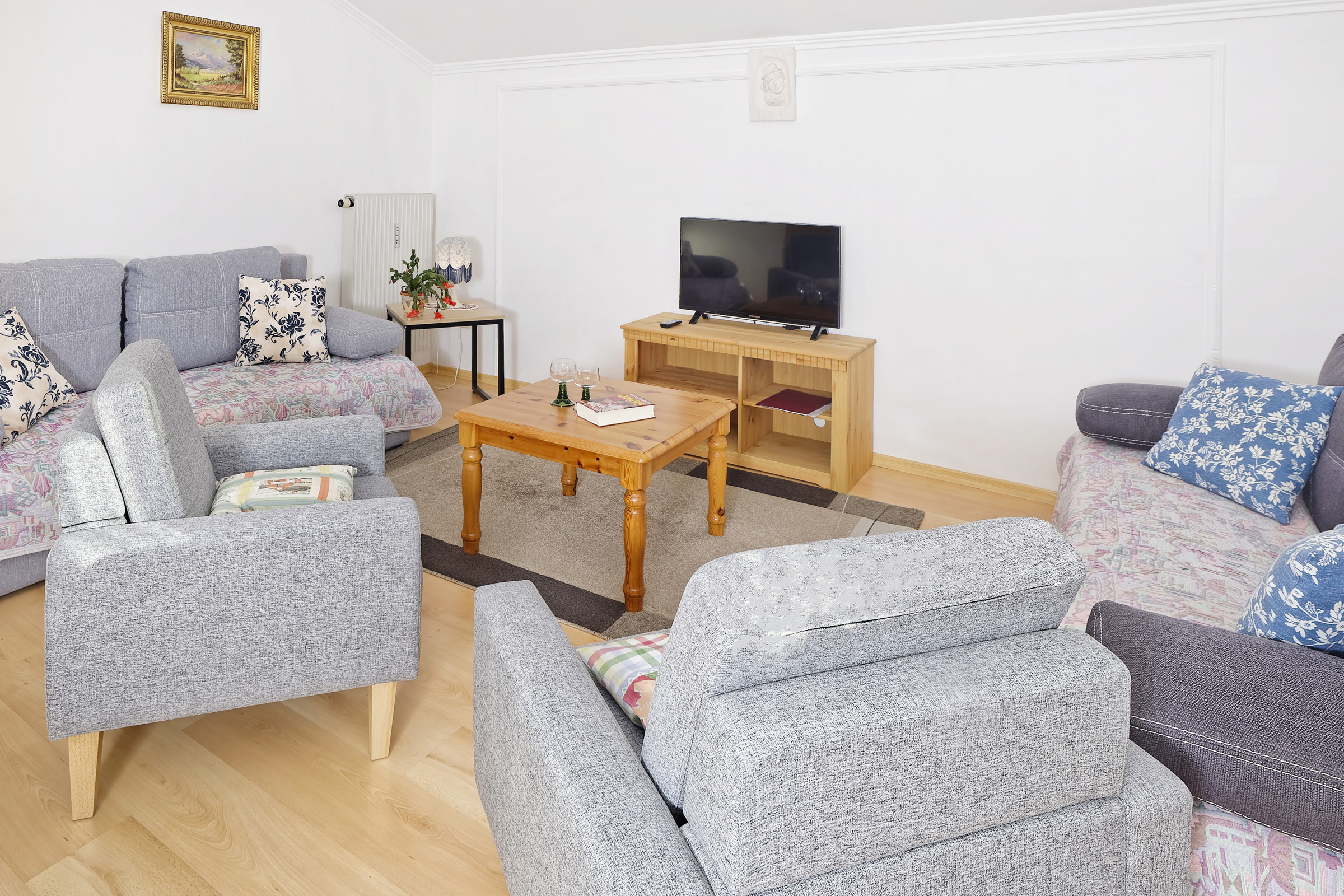 Das gemütliche Schlafzimmer mit einem Doppelbett (190 x 200 cm) sorgt für erholsame Nächte. Im geräumigen Wohnzimmer erwarten Sie eine bequeme Couchgarnitur, ein Flachbild-Digital-SAT-TV, Radio und kostenloses WLAN – ideal für entspannte Abende. Die separate Küche ist bestens ausgestattet mit Herd/Backofen, Spülmaschine, Kaffeemaschine, Kühlschrank mit Tiefkühlfach, Mikrowelle, Toaster, Wasserkocher und einer einladenden Essgruppe – alles, was Sie für ein gemütliches Frühstück oder ein entspanntes Essen benötigen.