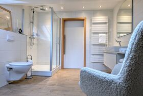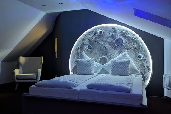 Die Himmel Suite bietet dir ein unvergleichliches Erlebnis. Der LED-beleuchtete Mond und der Sternenprojektor über dem Bett schaffen eine traumhafte, romantische Atmosphäre, während du durch die Dachfenster den Himmel bewundern kannst. Entspanne nach einem erlebnisreichen Tag mit dem luxuriösen Fußbadmassagegerät oder im Massagesessel. Eine gemütliche Leseecke, ein großer TV und der private Balkon mit Blick auf die Natur machen die Suite zu deinem perfekten Rückzugsort.