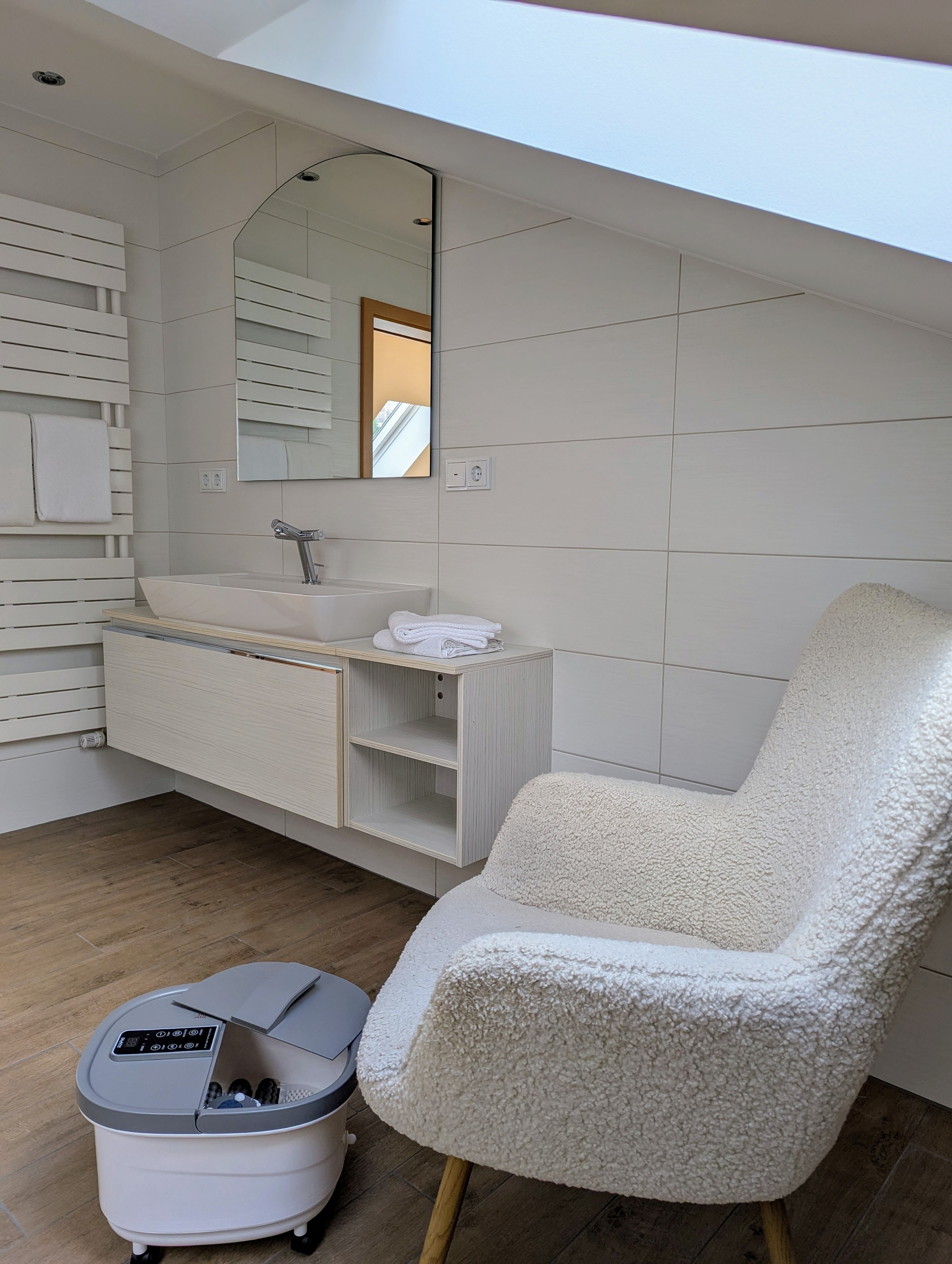 Perfekt für Paare, eine kleine Familie oder Alleinreisende, die eine erholsame Auszeit suchen. Das Schlafzimmer besticht durch ein gemütliches Doppelbett, über dem ein LED-beleuchteter Mond und ein Sternenlichtprojektor eine zauberhafte Atmosphäre schaffen – ideal für entspannte Abende. Auf Wunsch kann eine zusätzliche Person bequem auf einem Zustellbett untergebracht werden. Nach einem aktiven Tag sorgt ein Fußbadmassagegerät und ein Massagesessel für wohltuende Entspannung. Den Abend kannst du gemütlich auf dem privaten Balkon ausklingen lassen.