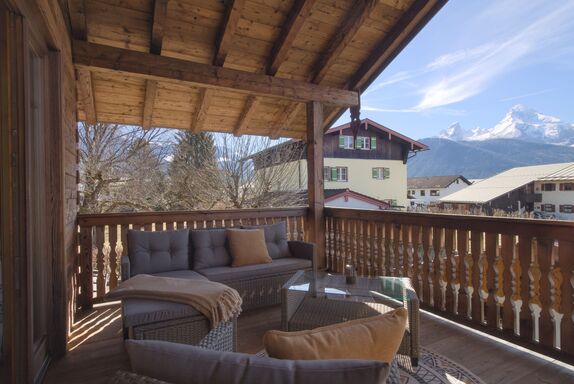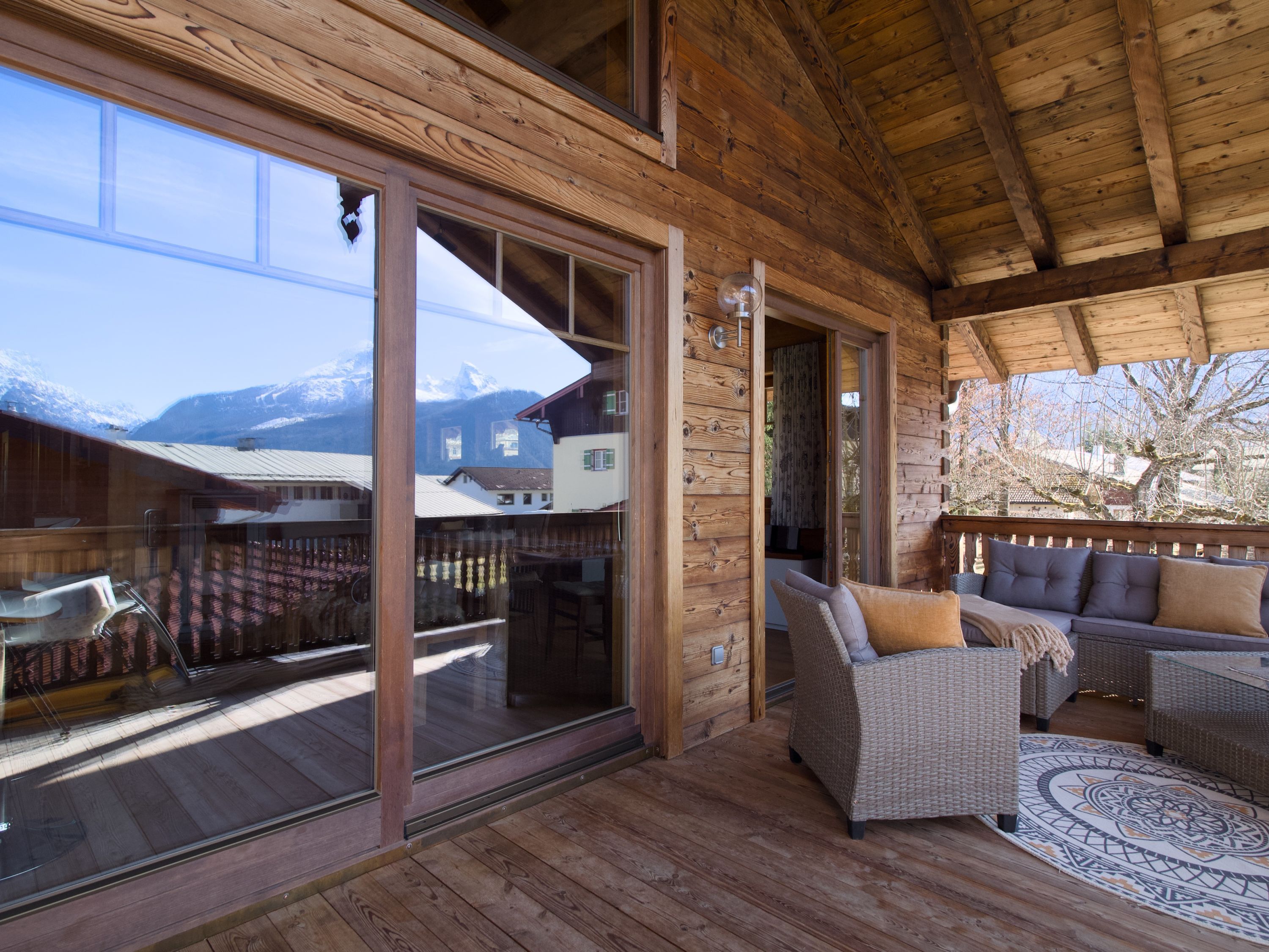 Große Terrasse mit traumhaftem Watzmannblick ein Lieblingsplatz, um den Tag mit einem Frühstück in der Morgensonne oder einem Glas Wein am Abend ausklingen zu lassen