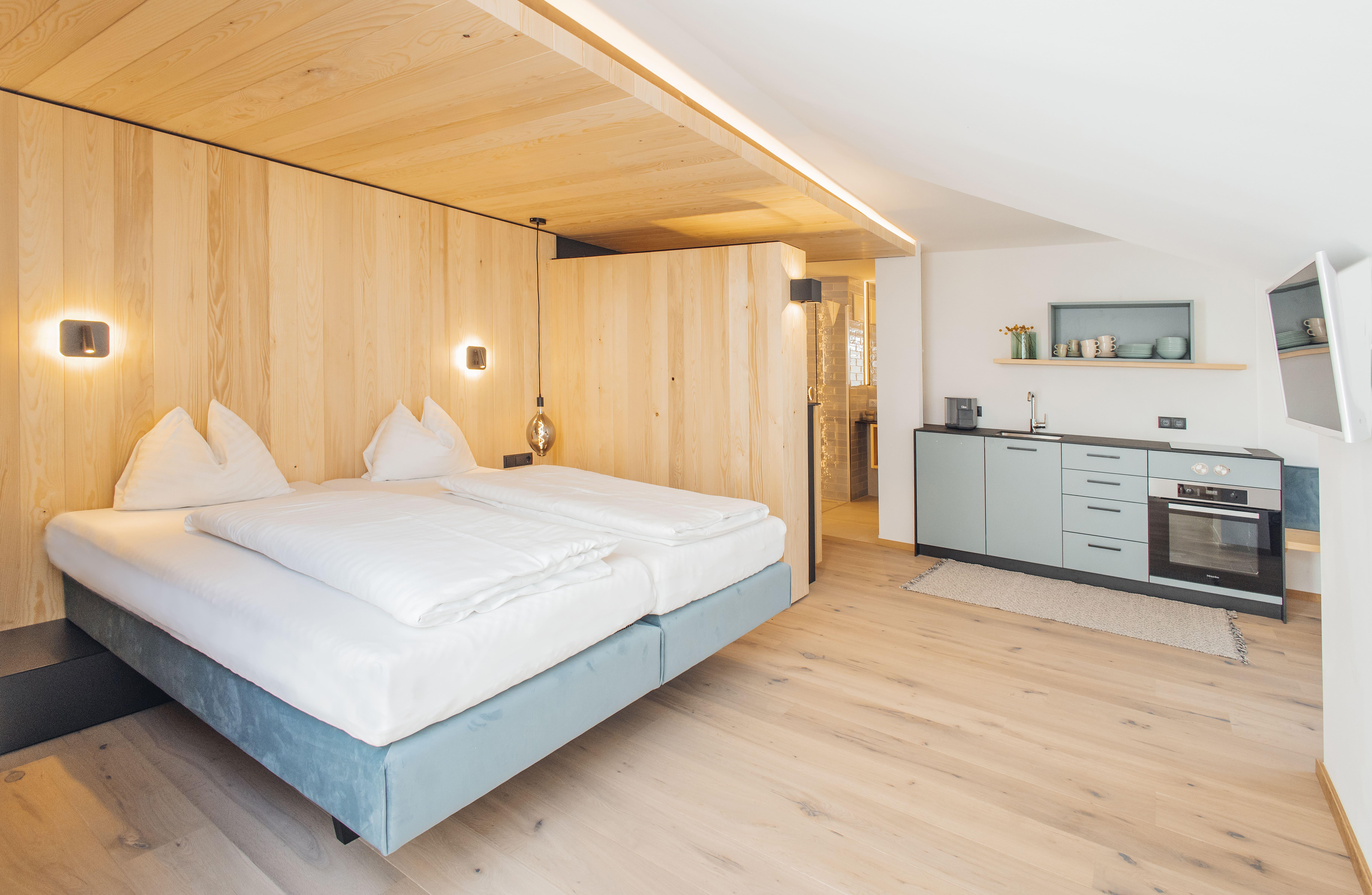 Das Appartement Theo bietet Platz für bis zu zwei Erwachsenen und ein Kind. Die frisch renovierte Ferienwohnung verfügt über ein großzügiges Schlafzimmer mit Boxspringbett sowie optional ein Einzelbett.