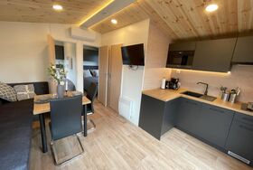 Übernachten Sie in einem unserer modernen Tinyhäusern und genießen Sie das Wohnen auf kleinem Raum. Die Tinyhäuser bieten mit Küchenzeile (Kühlschrank mit Gefrierfach, Kochfeld und Backofen oder Mikrowelle), Wohnbereich mit Eckcouch und Essplatz, TV, Bad (Dusche, WC, Föhn), einem räumlich abgetrennten Schlafbereich (1-2 Schlafzimmer) sowie Einbauschrankwand und zusätzlichem Stauraum genügend Platz für einen entspannten Aufenthalt. Jedes Tinyhaus hat eine Klimaanlage. Die Tinyhäuser sind komplett mit Ess- und Kochgeschirr, Filter-Kaffeemaschine, sowie Außenterrasse mit Gartenmöbel und Sonnenschirm ausgestattet. Ein Grill ist nicht vorhanden, kann aber gerne mitgebracht werden.