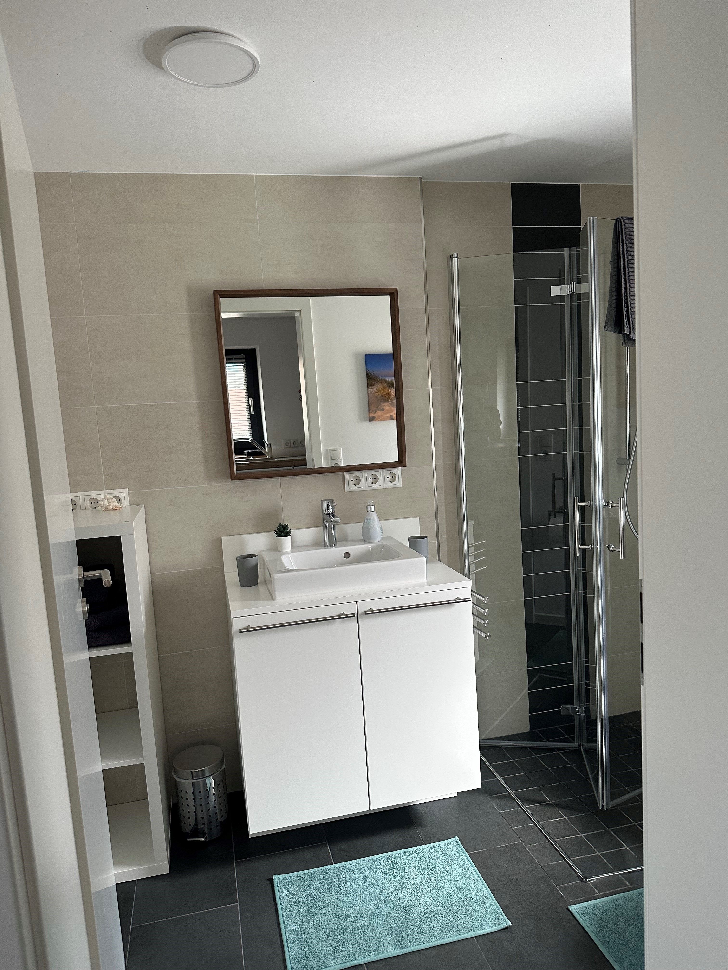 Das Badezimmer verfügt über eine begehbare Dusche, ein Waschbecken mit Spiegel, einen Haarfön, ein WC und ein Regal zur Aufbewahrung Ihrer persönlichen Sachen. Ebenso steht ein Wäscheständer zum Trocknen Ihrer Badekleidung nach dem eventuellen Besuch der Therme zur Verfügung.