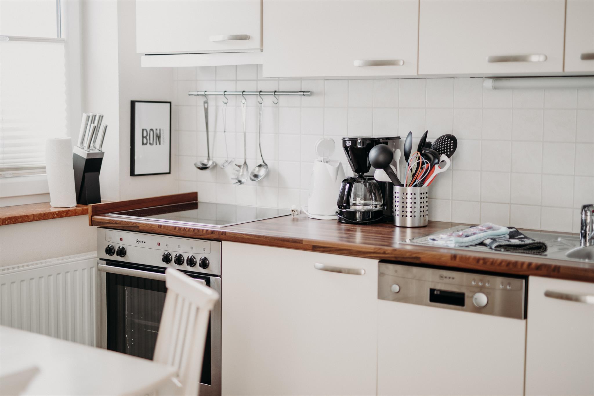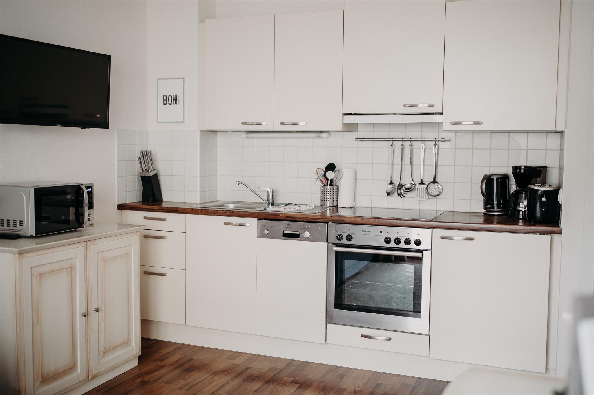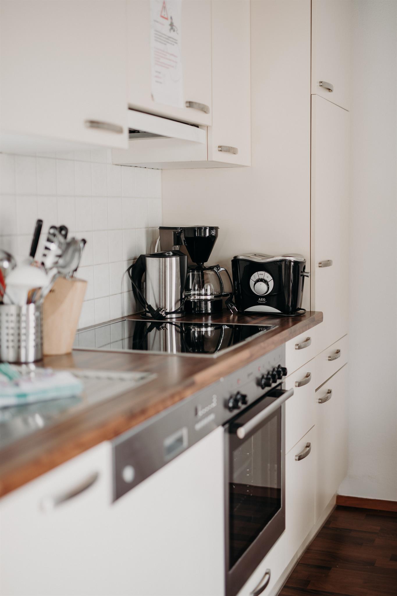 3 Schlafzimmer (eines davon klein), 2 Bäder, Wohnschlafraum mit Schlafsofa | für 6 bis 8 Personen | Balkon | Küchenbereich mit Geschirr, Backofen, 4 elektrische Herdplatten, Kühlschrank mit Gefrierfach, Geschirrspüler, Wasserkocher, Nespresso Maschin