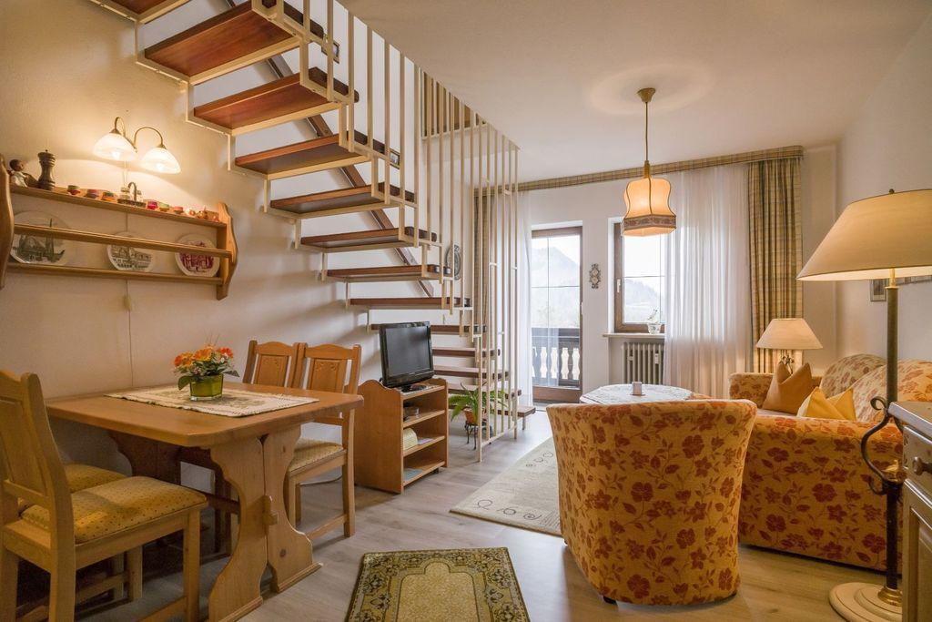Im Inneren erwartet Sie eine liebevoll mit Massivholz-Möbeln im ländlichen Stil ausgestattete Wohnung, die keine Wünsche offenlässt. Das gemütlich eingerichtete Wohnzimmer, komplett mit Sitz- und Ess-Ecke, sowie die voll ausgestattete Einbau-Küche, inklusive Geschirrspüler, Backofen mit Ceran-Kochfeld, Mikrowelle und Kühl-Gefrierschrank, laden zu gemeinsamen Stunden ein. Über eine Treppe gelangen Sie ins Schlafzimmer, welches mit einem Doppelbett und einer zusätzlichen Liege bestückt ist, sowie ins Bad mit separatem WC.