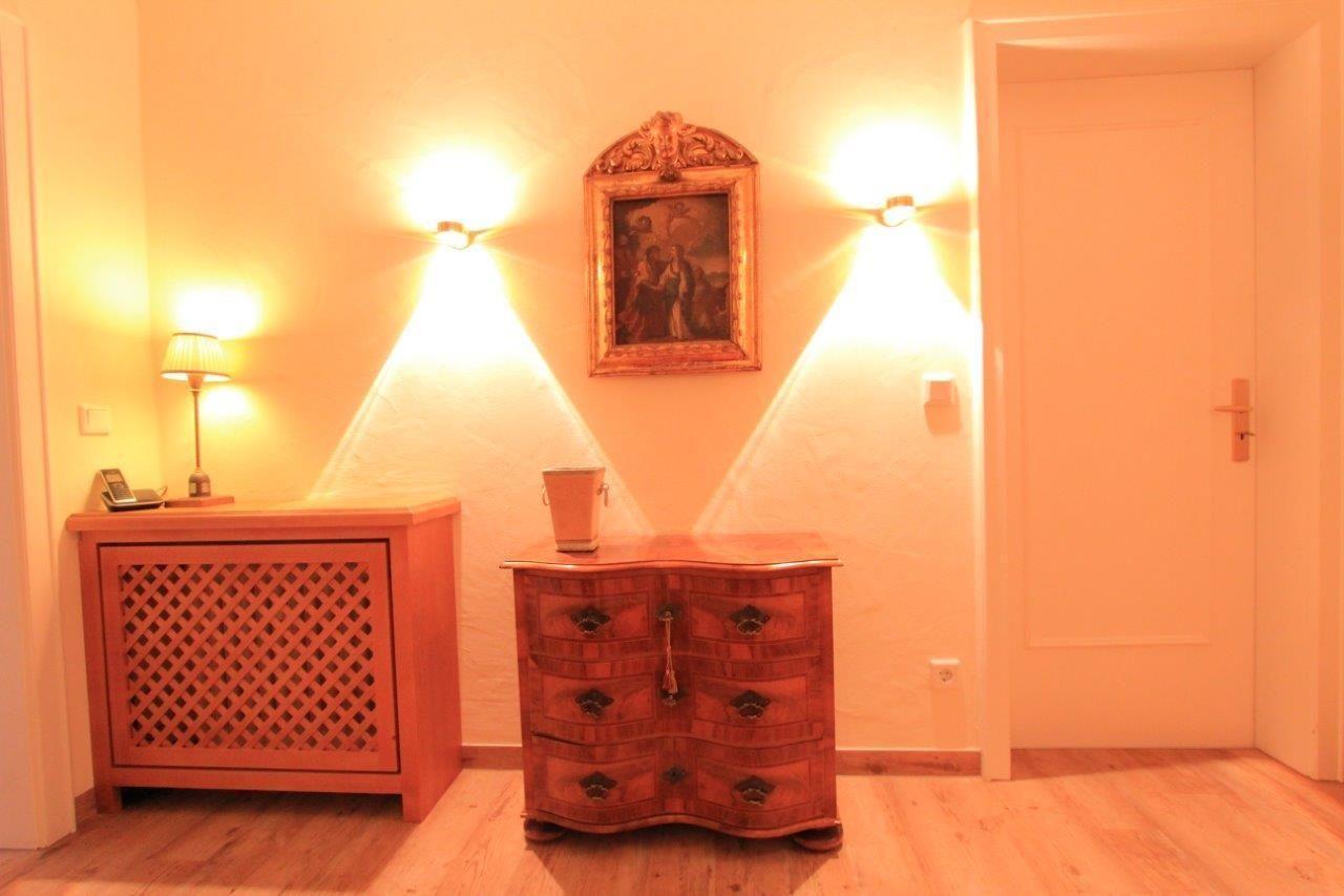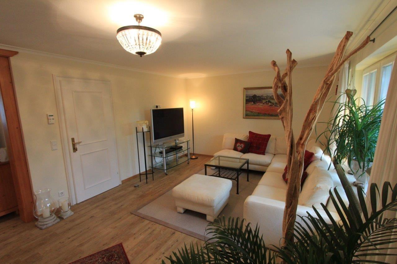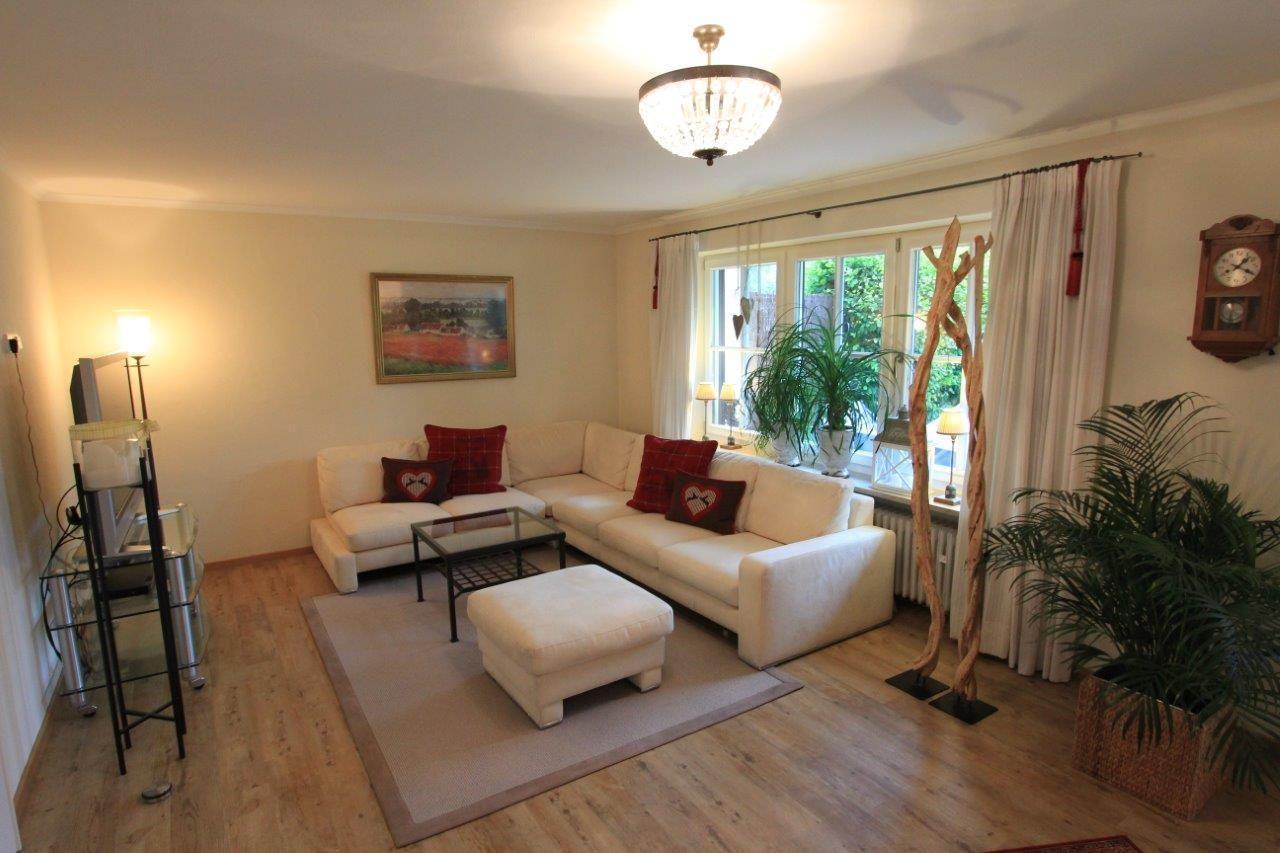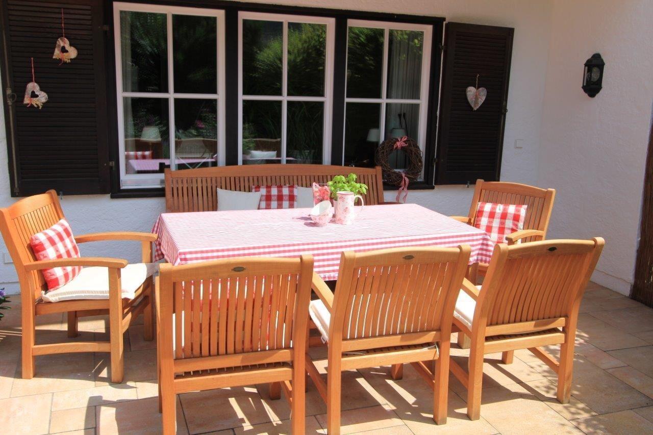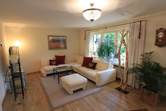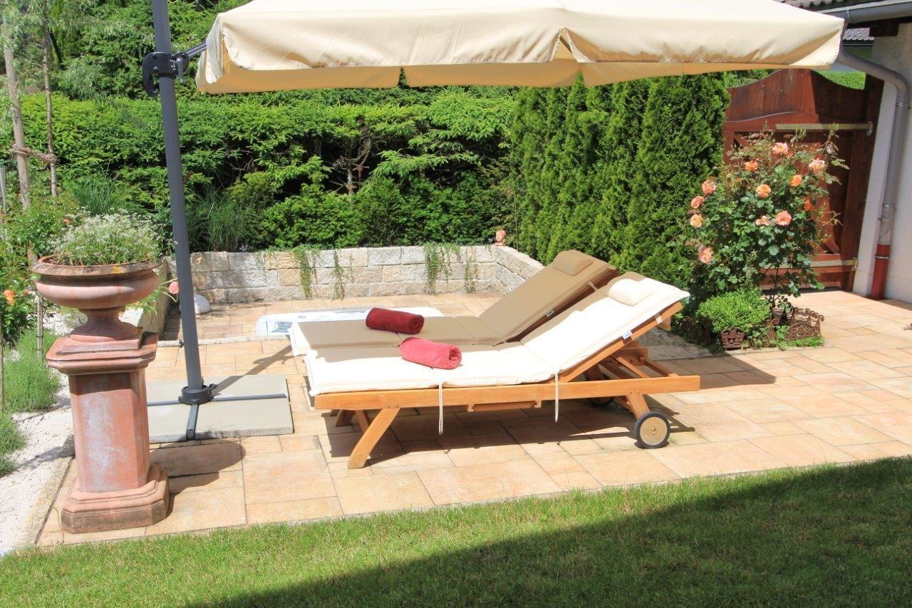 Zur Villa gehört ein wunderschöner, neu angelegter Blumen-Garten (700qm), große Süd-Terrasse (35qm) und Jakuzee/Spa Bereich mit Liegen und Whirlpool (Herbst-/Winterbetrieb). Parkett-/Dielenböden im gesamten Haus, zusätzlich Teppiche. Der Einrichtungsstil vermittelt bayerische Gemütlichkeit ohne zu „jodeln“ (d.h. wohldosiert).
