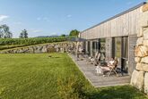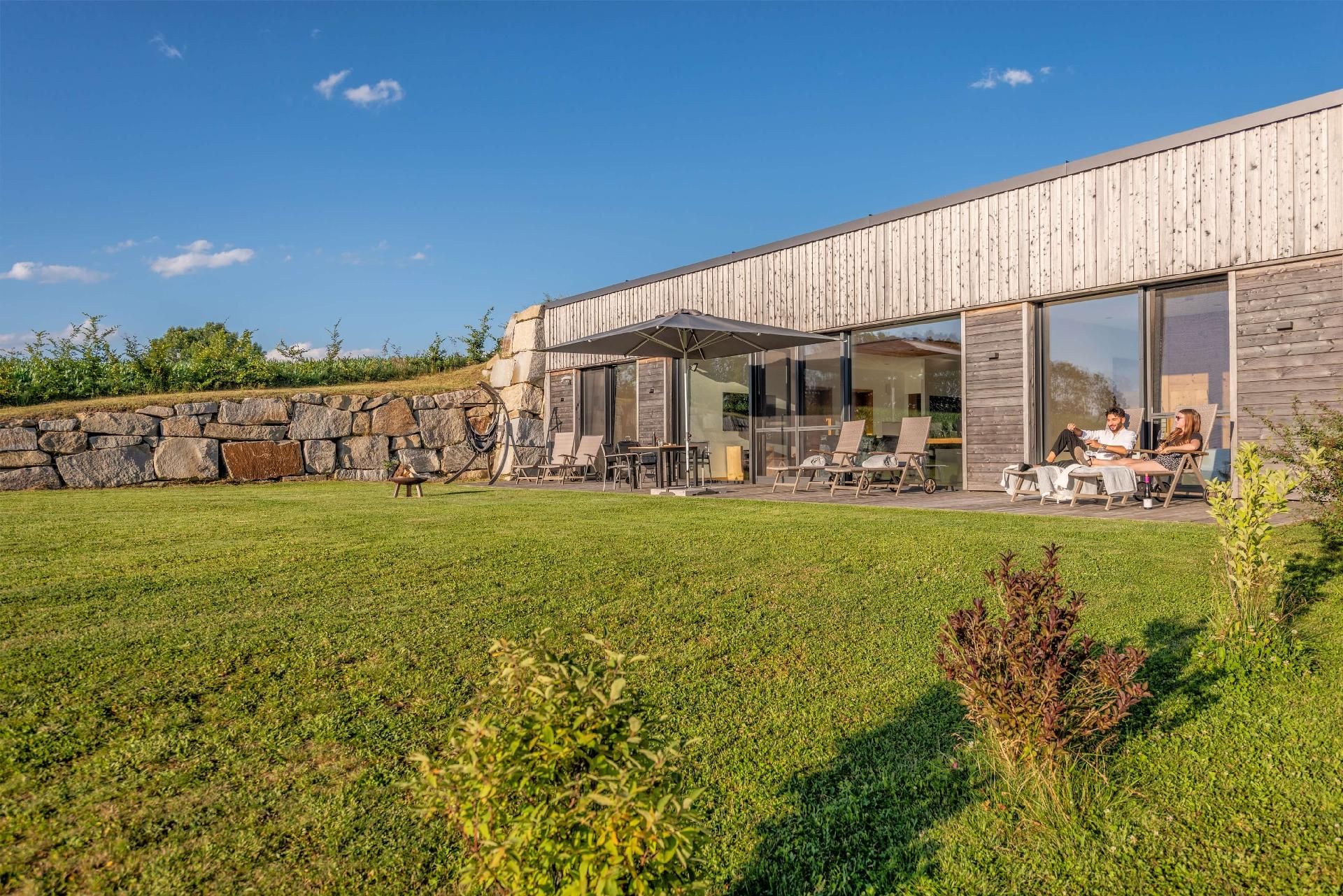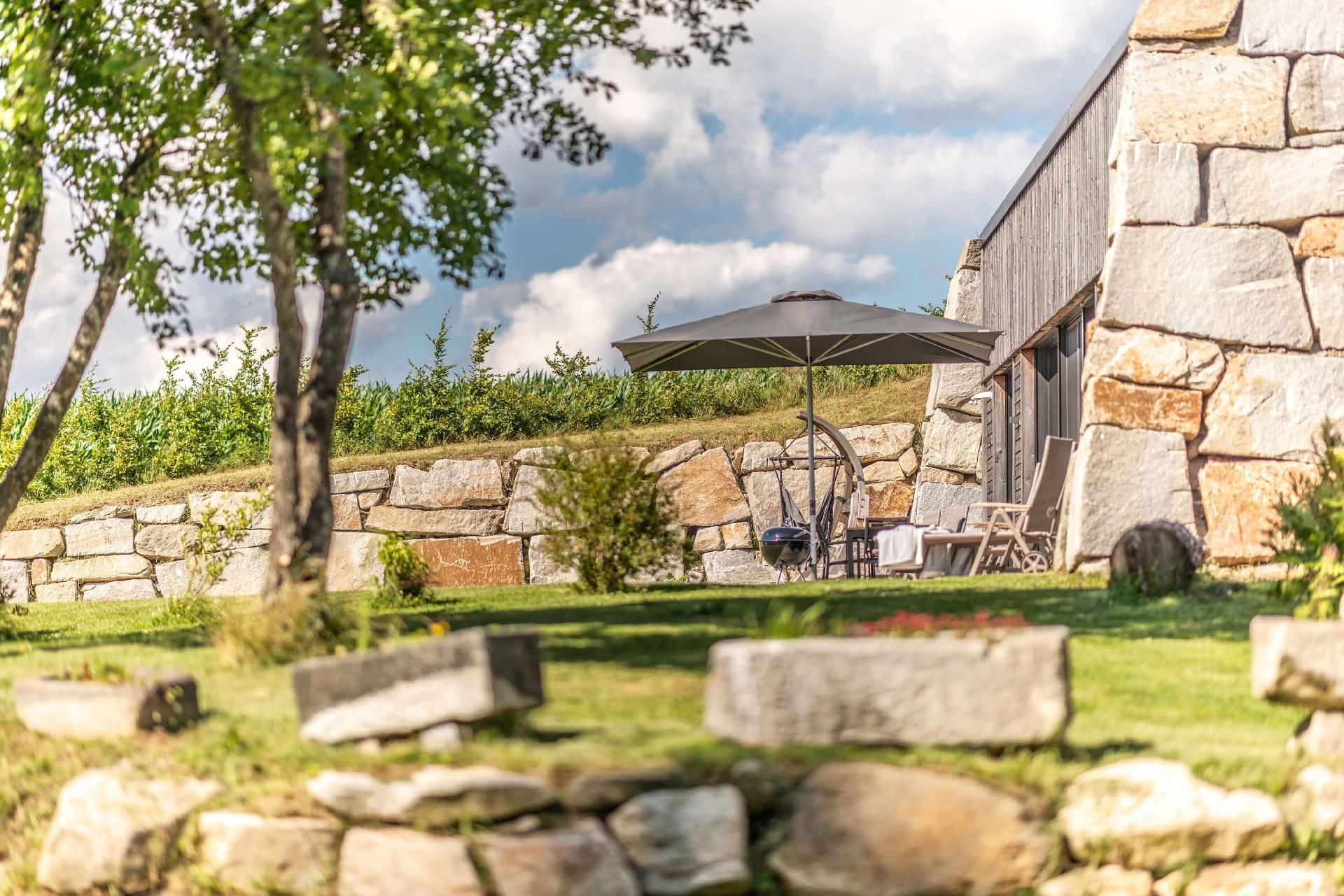 Der Außenbereich lädt mit einer großzügigen Terrasse, auf der Sie in hochwertigen Gartenmöbeln unter einem großen Schirm entspannen können, zum Verweilen ein. Zur weiteren Ausstattung gehören ein eigener Grill, ein Lagerfeuerplatz und eine Hängematte, die perfekte Bedingungen für gemütliche Abendstunden bieten. Kinder finden Freude auf dem kleinen Spielplatz, während der Weiher sowie ein Obst- und Kräutergarten zum Entdecken einladen.