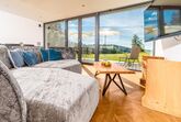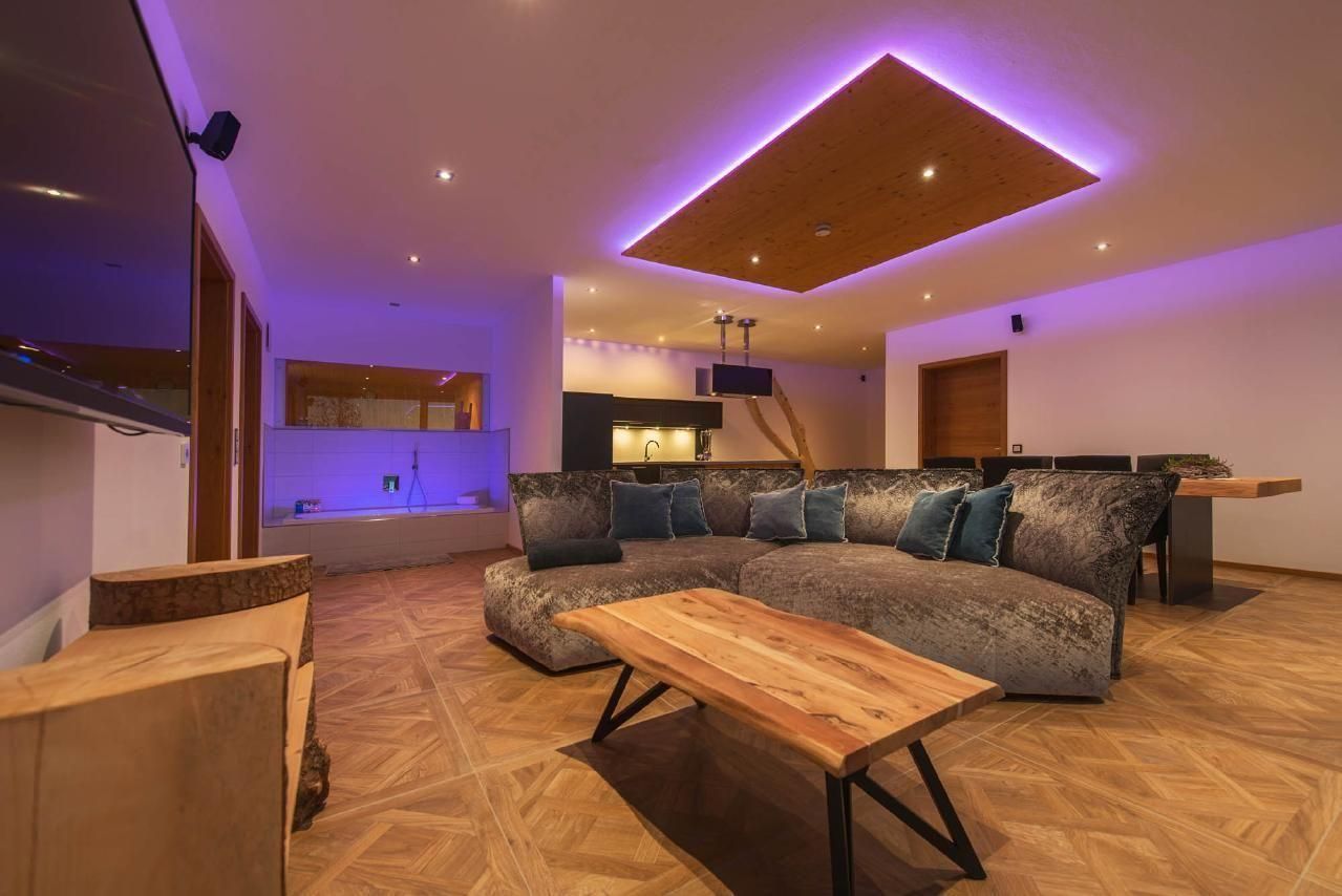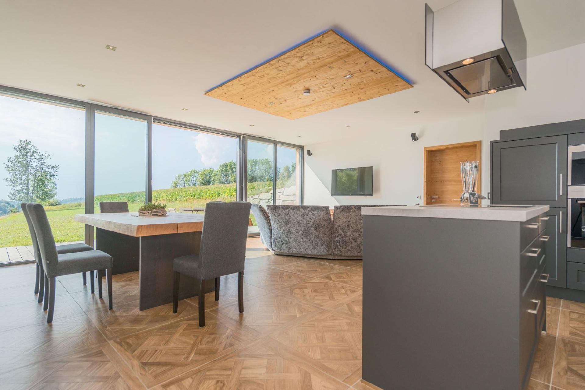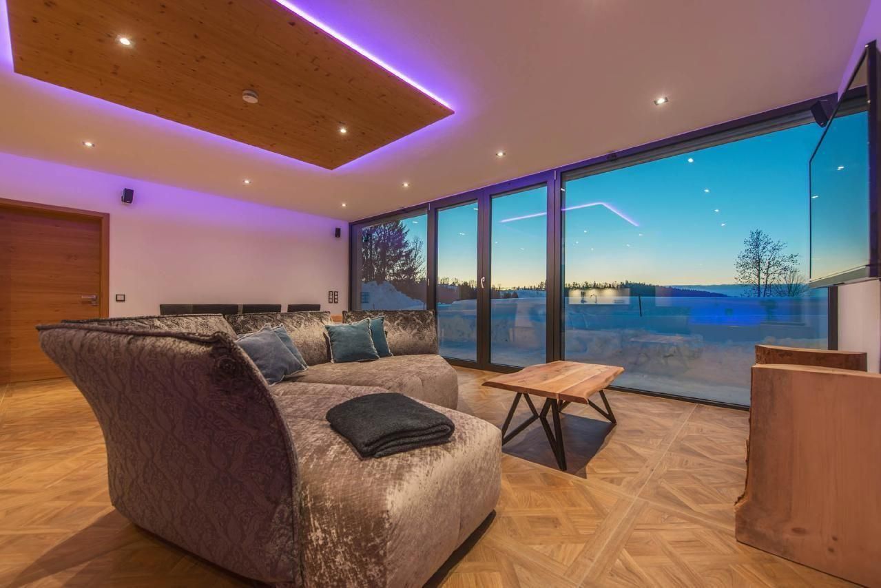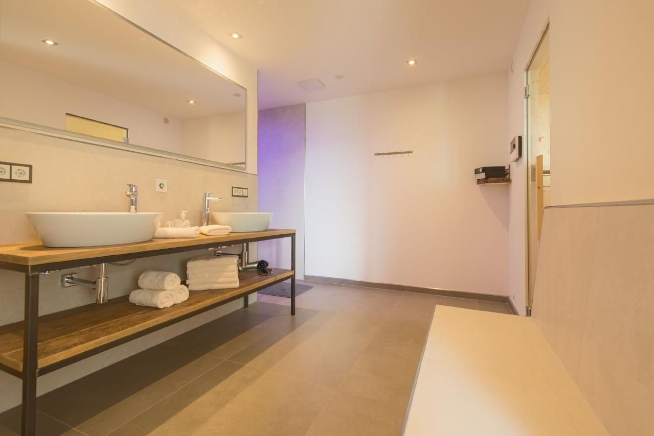 Das Herzstück des Hauses bildet der über 50qm große Wohn- und Wohlfühlbereich, der mit einer hochwertig ausgestatteten Küche, einem handgefertigten Eichentisch und einem gigantischen Riesensofa ausgestattet ist. Genießen Sie hier Dolby-Surround-Sound und die spektakuläre Aussicht durch das bodentiefe Fenster. Eine offene Whirlwanne mit Blick auf die Natur, zwei Schlafzimmer mit eigenem TV, extralangen Doppelbetten und einer kleinen Galerie für Kinder, sowie ein Badezimmer mit Wärmebank, geräumiger Dusche mit Schwall- und Tropenregenanlage und direktem Zugang zur Sauna runden das hochwertige Wohnangebot ab.