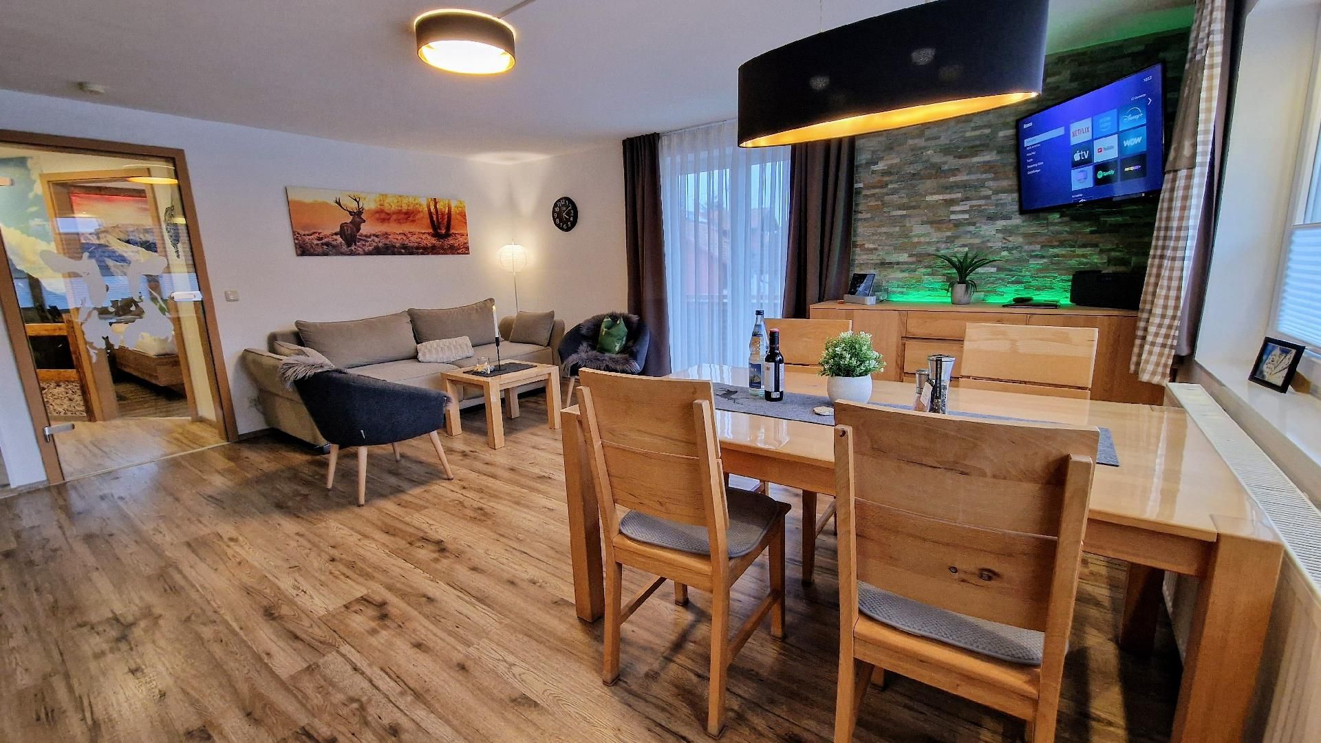 Wohlfühl-Ferienwohnung mit einem Schlafzimmer, Smart-TV, Babybett, Wohnraum mit Küche, Essbereich, SMART Flachbild-TV und Schlafsofa, Badezimmer, separaten WC, großen Balkon.nkaufsmöglichkeiten.- ruhige und sonnige Lage