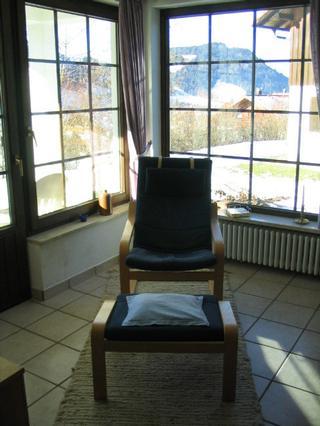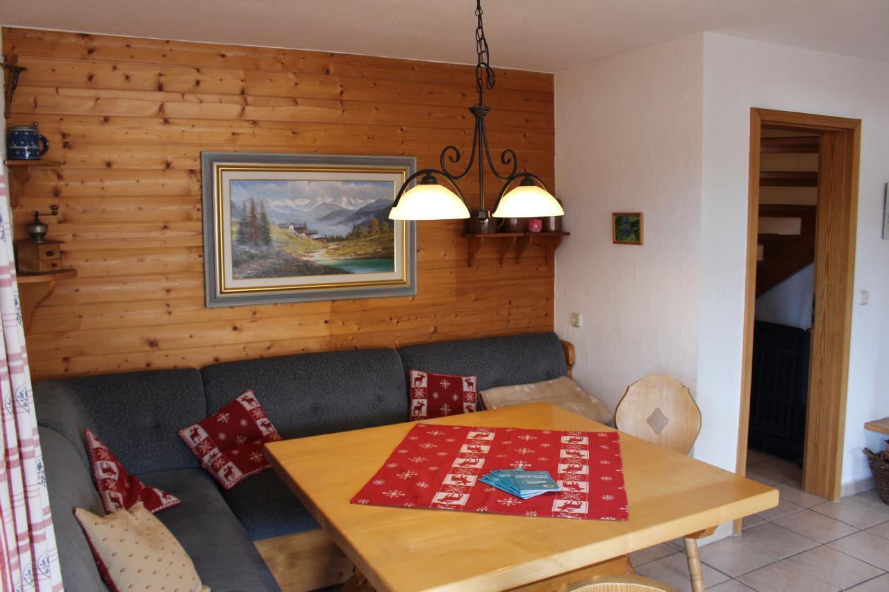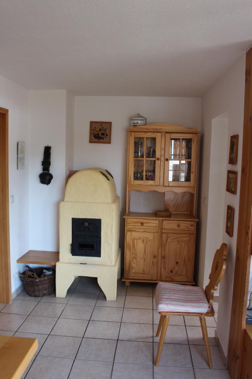 Sonstige Wohnzimmerausstattung : Wohnraum mit gemütlicher Ess-/Sitzecke, wohliger Kachelofen und Ausgang auf die herrliche Südterrasse und Garten. Farb-Kabel- TV inkl. Radio, Mini-Hifi-Anlage mit CD, Internetanschluß (Nutzung inkl.)
