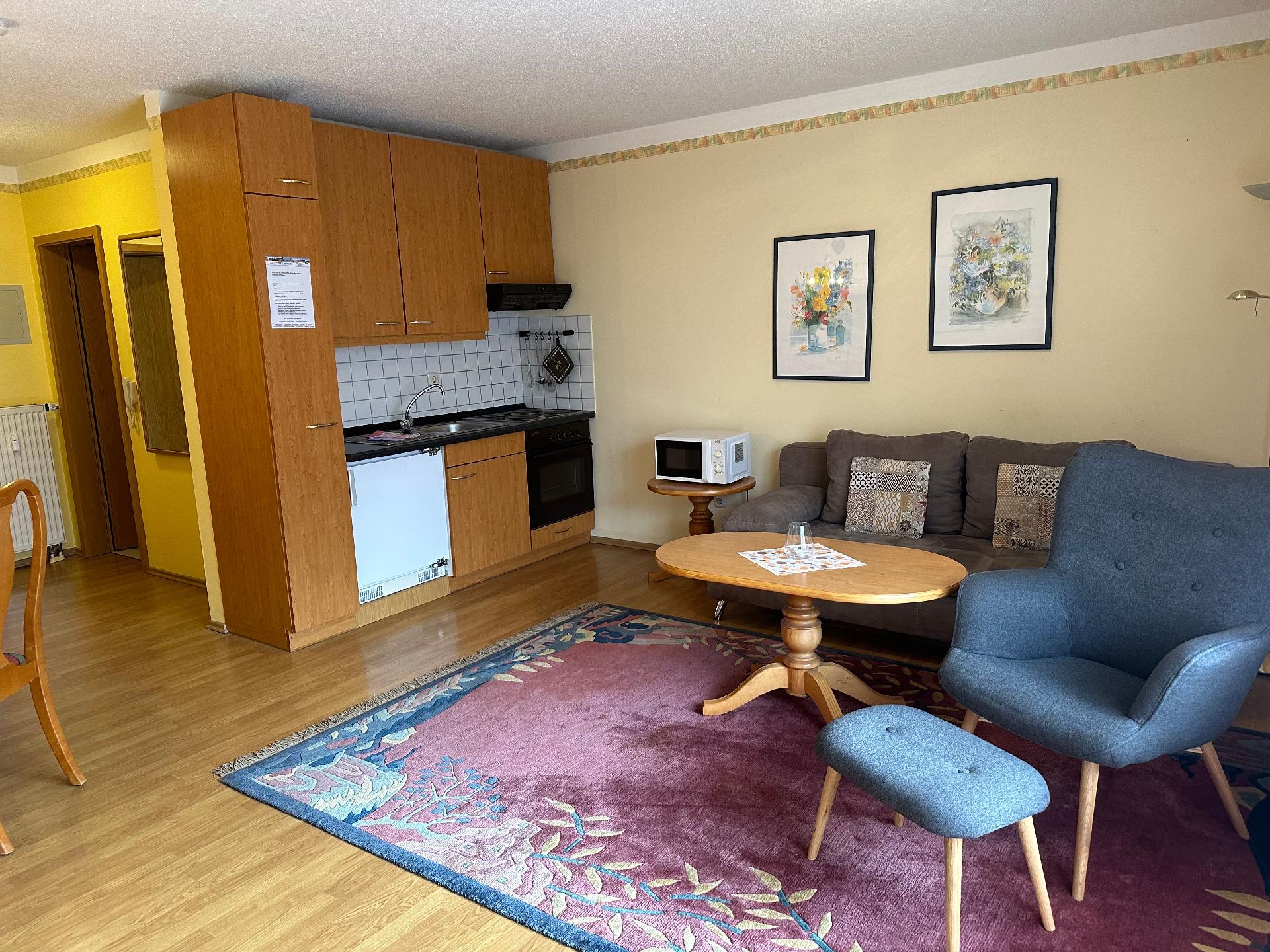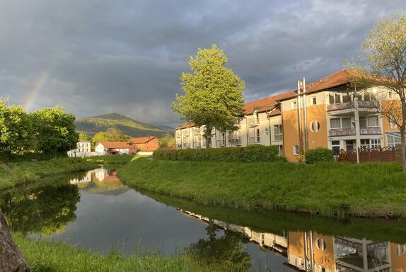 Gepflegtes Appartement in Appartement-Anlage - zentrumsnah und doch im Grünen, idyllisch an einer romantischen Flußbiegung gelegen. 2-Zimmer Appartement für 1-2 Personen mit Balkon (einer zur Regenseite, einer zur Innenseite) oder Terrasse. Unser Highlight: Täglich 3 Stunden freier Eintritt in die 200 m neben den Appartements gelegene komplette AQACUR-Wellness- und Badewelt inkl. Riesenreifenrutsche (Abreisetag ist nicht enthalten, im März und September sind jeweils Revisionstermine, hier ist das AQACUR dann 5 Tage geschlossen). Unser Service: Tiefgaragenstellplatz mit Möglichkeit zur Fahrradabstellung, Waschmaschine und Trockner gegen Gebühr, Frühstück und Halbpension in ca. 5 Gehminuten zubuchbar, Haustiere gegen Gebühr herzlich willkommen, kostenfrei Kinderbett und Hochstuhl auf Anmeldung, kostenfreie Bus- und Bahnnutzung, W-lan Das Appartement verfügt über einen sep. Schlafraum, ein Badezimmer und einen Wohnraum mit kompl. komfortabel ausgestatteter Küche