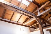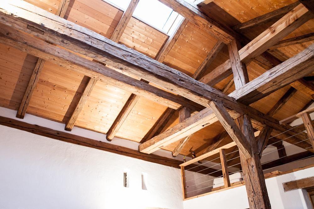 Innen besticht die Wohnung durch eine gelungene Kombination aus alt und neu. Die beeindruckenden Holzbalkenkonstruktionen ziehen dabei besonders die Blicke auf sich. Die voll ausgestattete offene Küche verfügt über ein Ceranfeld, einen Backofen, eine Spülmaschine, Kühlschrank, Kaffeemaschine und Wasserkocher. Das Wohnzimmer ist ausgestattet mit einem schönen alten Tisch und modernen Stühlen für Ihre Mahlzeiten, ergänzt durch ein gemütliches Sofa vor einem Fernseher. Das moderne Badezimmer bietet neben einer Badewanne, WC, und Föhn auch eine praktische Waschmaschine. Der Schlafbereich, erreichbar über eine Holztreppe zur Galerie, überrascht mit zwei großen Doppelbetten (200 x 200 cm), wobei das zweite Bett durch eine spannende Durchschlupfmöglichkeit unter dem Hauptbalken zugänglich ist.