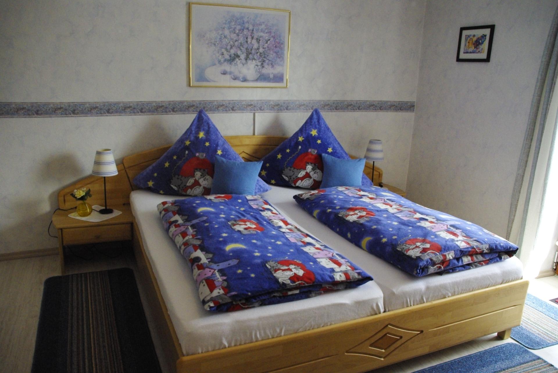 Die helle Ferienwohnung mit einer Wohnfläche von 38qm bietet Platz für bis zu drei Personen und liegt auf der ersten Etage. Das Schlafzimmer ist 14,5m² groß und verfügt über ein Doppelbett mit 180x200cm, Schrank, Balkontüre, Sitzgruppe, Schminkmöglichkeit und Laminatboden. Die Küchenzeile in der Wohnküche ist ausgestattet mit Kühlschrank und Eisfach, Mikrowelle, Spüle, zwei Cerankochplatten und allem Geschirr und Kochgeräten sowie Kaffeemaschine, Eierkocher, Toaster und Wasserkocher. Die Wohnküche ist 14,1 m² und mit PVC-Boden ausgelegt und bietet noch eine Schlafcouch, diverse Schränke, Essgruppe,