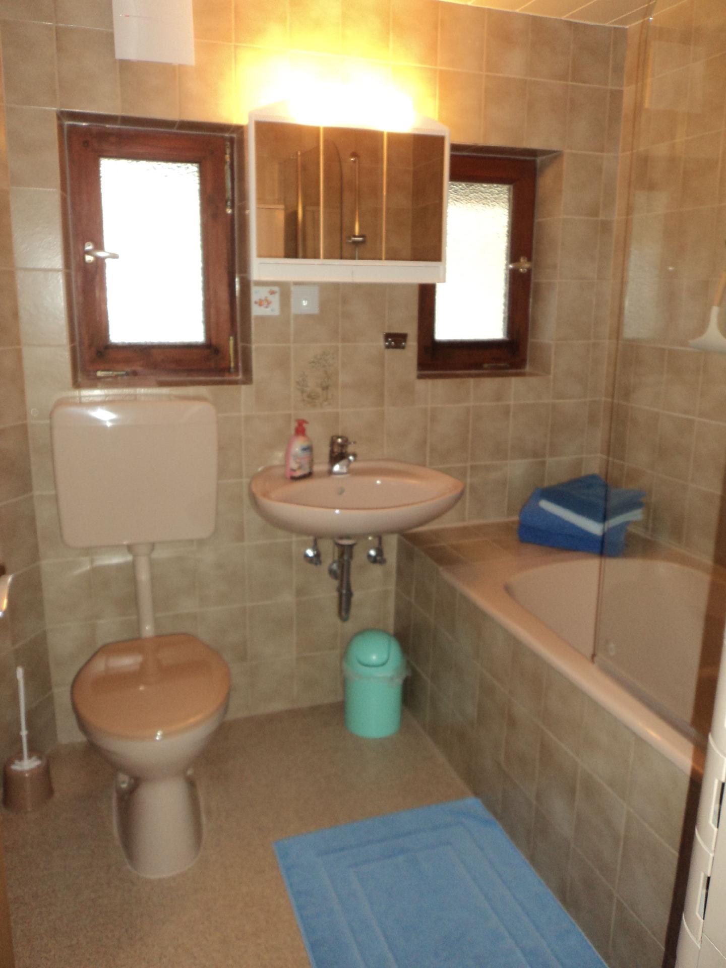TV mit Satempfang, Internet per Lan und Wlan möglich, Gesellschaftsspiele vorhanden sowie eine Balkontüre und Fenster. Das Badezimmer ist 4,2m² groß und hat Fenster mit Tageslicht, WC, Badewanne mit Duschmöglichkeit, Waschbecken, Spiegelschrank und PVC-Boden.