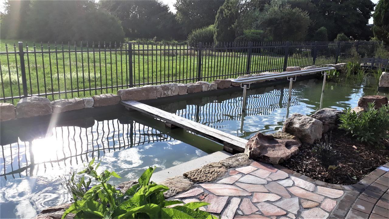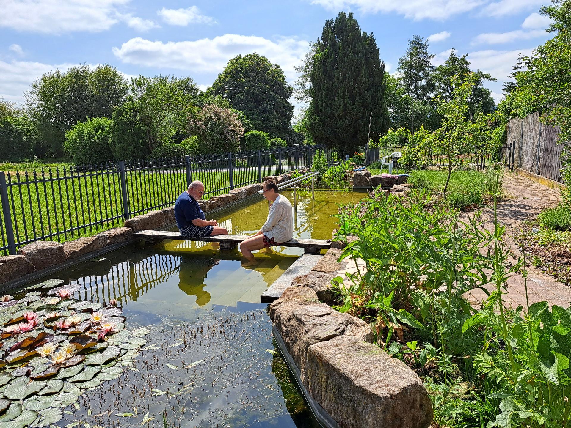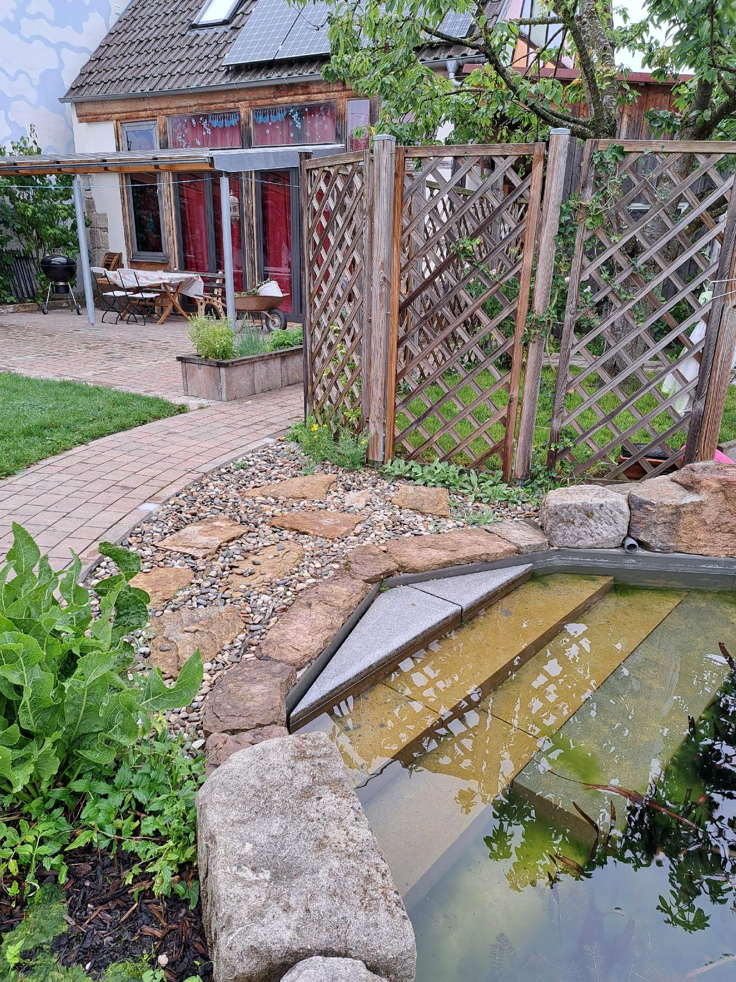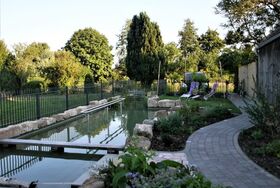 Gebetslabyrinth, Gartentische mit Bestühlung und entsprechenden Kissen, 2 x Grill, genug Liegestühle für alle, 2 Wiesen, Gärten, Kneippeinrichtung mit Sauna und Naturpool mit Trett-, Arm- Tauch und Liegebereiche im Wasser... besonders ruhig gelegen am Rande des kleinen Dorfes