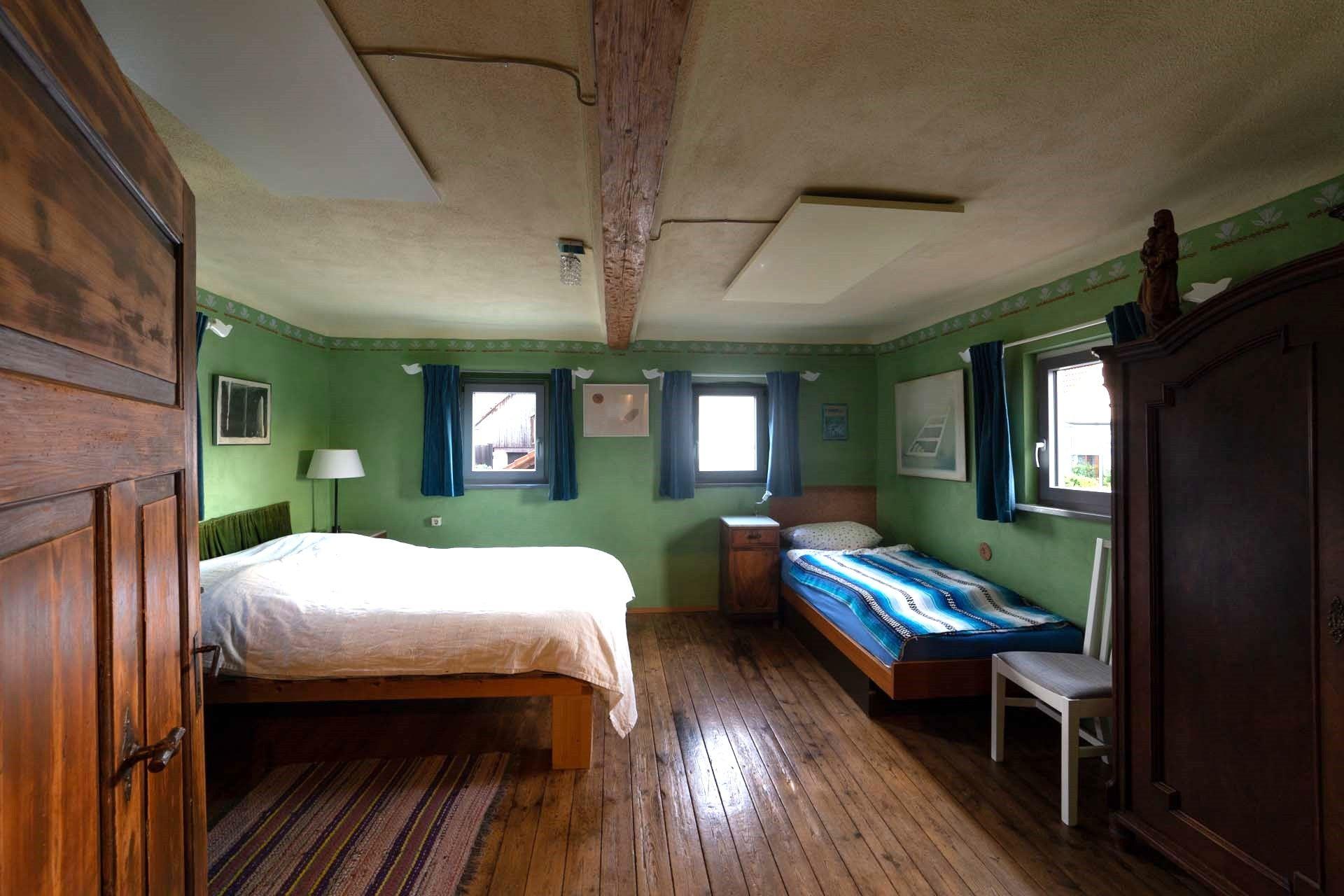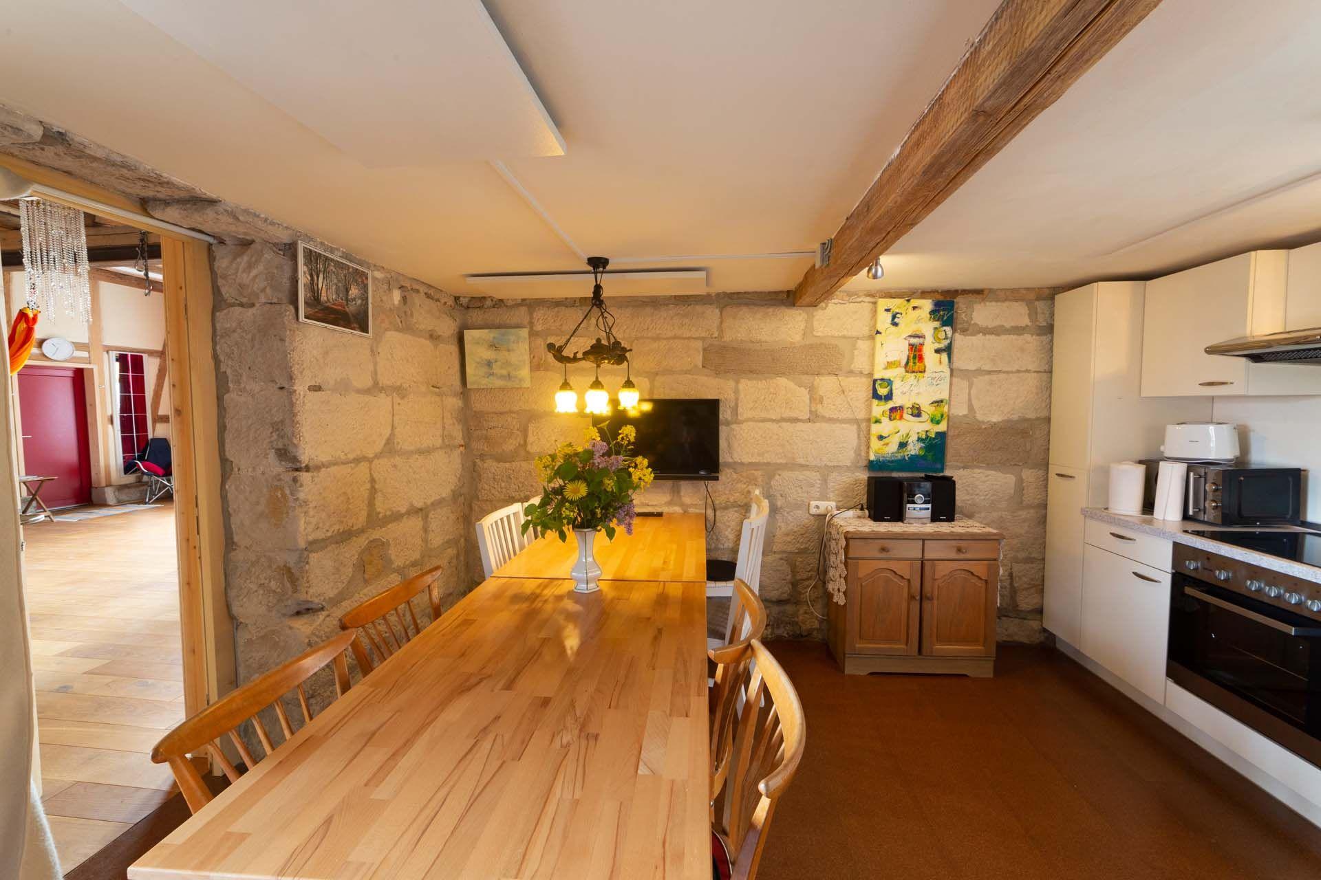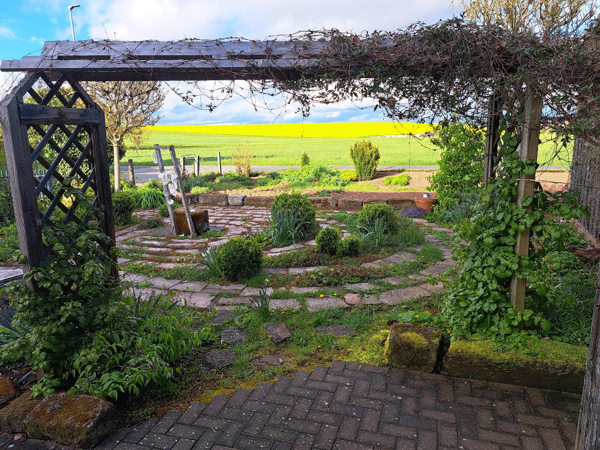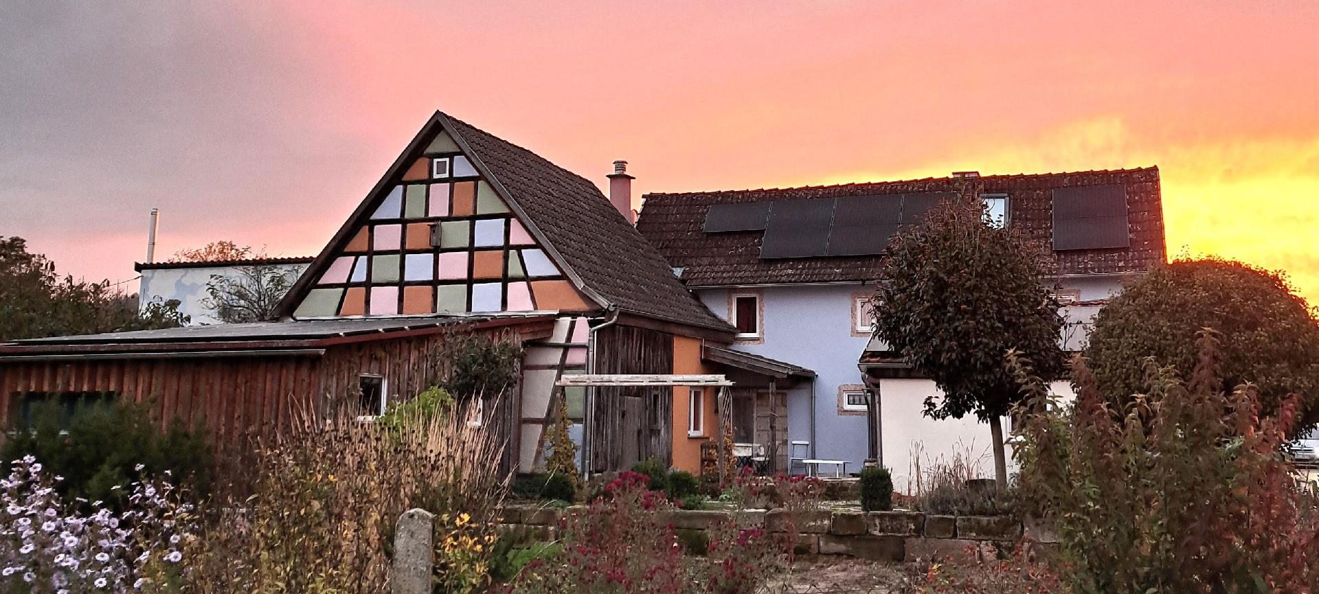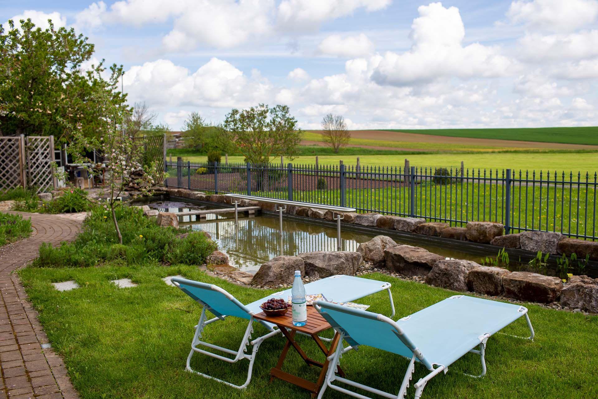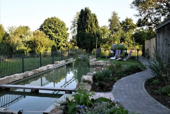 Hier haben Sie die kühle Magie der eigenen Naturpool als Kneippanlage, Kinderschwimmbecken und als Verweilort am und im Wasser. Das Ferienhaus Kimmelsbacher Hof im Naturpark Haßberge ist für Selbstversorger, hat 4-DTV-Sterne und ist einfach besonders. Es bietet ein Höchstmaß an Komfort – besonders die Küche ist gut ausgestattet- und ist gleichzeitig ungewöhnlich, märchenhaft und voller Überraschungen, Entdeckungen und Zauber. Das eigene Gelände ist am äußersten Rande des Dorfes in der Umgebung von geomantischen Kraftorten, Naturschutzgebiete, aber auch von historische Schlösse und Nutzlandschaft, aus der unsere Nahrung kommt, umgeben. Sie haben zwei Terrassen, Kneippgarten, Sauna, Tauch-, Arm- und Tretbecken für sich allein, sowie die Mitbenutzung von dem Gebetslabyrinth. Vom Grundstuck und von vielen Fenstern aus sehen sie Felder und Wälder. Im Haus sehen Sie eine vielfältige Auswahl an Gemälde und Kunstwerke und die urige Architektur, des alten und ökologisch top-sanierten Haus. Zu jeder Jahreszeit und bei jeder Wetterlage ist das Haus großenteils durch Infrarot Deckenheizung wohltemperiert, einen gemütlichen Aufenthaltsort. Die liebliche Gegend ist voll von traumhaften Wander- und Radwanderwege, sowie allerart Ausflugsziele. Mit seiner zentralen Lage in Deutschland ist es ein idealer Verweilort für Menschen, die sich mögen.