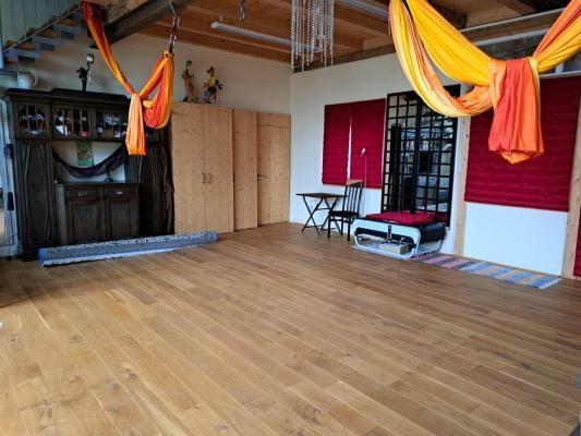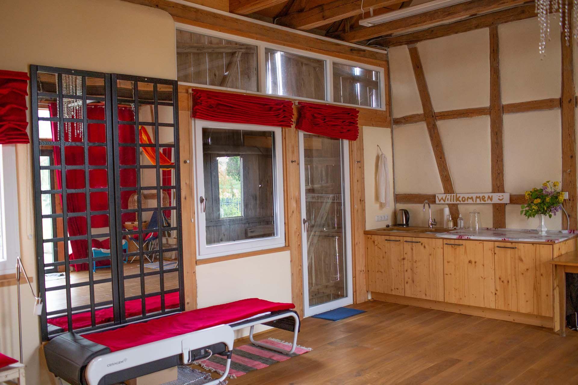 Die ehemalige Scheune ist das Herzstuck von Kimmelsbacher Hof. Als Argentinische Tangotänzerin und Yoga- Begeisterte erfüllt mir der Eichen-Schwingboden den Wünschtraum. In Kleingruppen von 5 bis 6 Personen ist der 48qm Raum ideal, um Yoga zu praktizieren, zu tanzen oder eine Aufführung vorzubereiten. Die zwei Arealyogatücher können hochgebunden werden oder in der eigenen Praxis eingebunden werden. Der Ceragem-Massage-Liege wirkt heilsam auf den gesamten Körper. Gymnastikbälle, eine Hulahoopreifen und sonstige Gymnastikzubehör stehen zur Verfügung. Die eigene Musik und sonstige Zubehör werden jeweils mitgebracht.