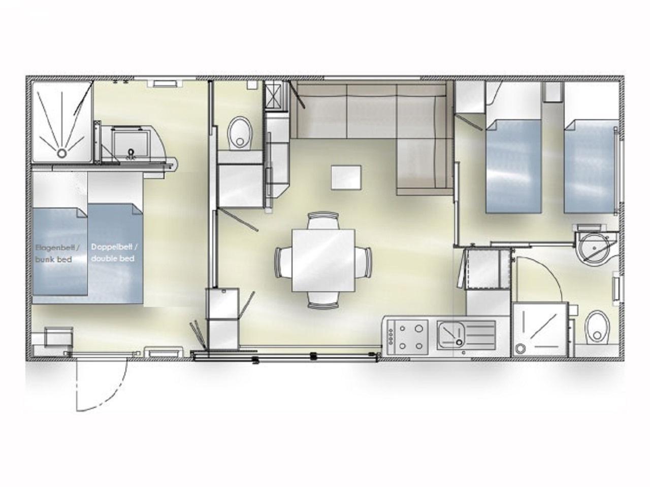 Das Ferienhaus in Wackersdorf besitzt zwei Schlafzimmer, zwei tolle Badezimmer sowie einen großzügigen Wohn- / Essbereich mit Schlafcouch und ist für bis zu 5 Personen bestens geeignet. Das Mobilheim bietet durch seine geschickte Raumaufteilung auf 40m² alles, was Sie für einen erholsamen Aufenthalt benötigen. Die voll ausgestattete Küche besitzt alle notwendigen elektronischen Geräte wie Kühl-/Gefrierschrank, Kaffeemaschine etc.