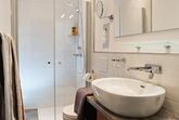Im kuscheligen Schlafzimmer liegen Sie höchstkomfortabel auf einem massiven Boxspring-Doppelbett unter wohltemperierenden Daunendecken; am Abend genießen Sie die himmlische Ruhe im idyllischen Innenhof. Wie im gesamten Haus sind auch hier Fußbodenheizungen installiert, die die Wärmestrahlung angenehm gleichmäßig abgeben. Stilecht dienen an Fenster und der Tür zum Innenhof sonnengelbe Rollos als Sichtschutz, das Parkett gestaltet die Räume trittsympathisch und gleichzeitig so pflegeleicht, wie der freundlich-hell gestaltete Nassbereich und der großzügige Schrankraum mit Schreibtisch und Sitzecke.