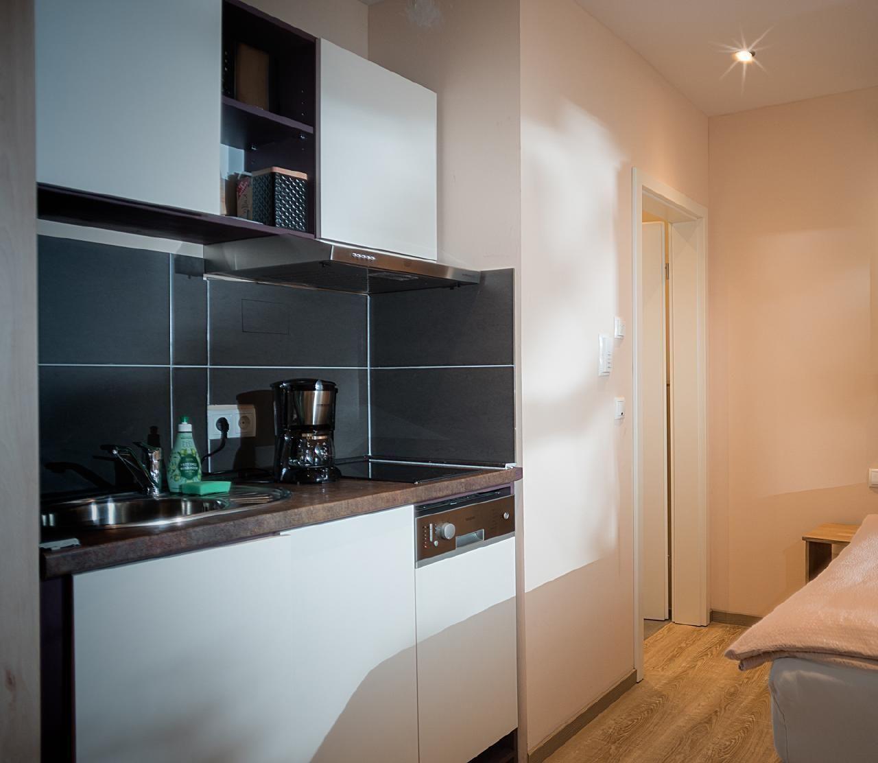 Kochen: 2-Plattenherd; Kaffeemaschine; Kühlschrank; Spülmaschine; Toaster; Wasserkocher
