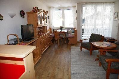 Die Wohnung Nr. 211 im 2. Stock mit Westbalkon und herrlicher Aussicht auf die Berge und den Garten ist gemütlich eingerichtet.
