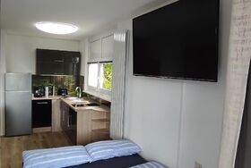 Das 33m² große Apartment besteht aus einem kombinierten Wohn- und Schlafzimmer mit Küchenzeile und einem modernen Duschbad. Vom großen Balkon haben Sie eine wunderschöne Sicht auf die umliegenden Berge und den Wald runter bis ins Donautal – und mehrmals bei klarer Sicht sogar bis in die Alpen. Die Schlafmöglichkeiten, ein Boxspringbett und eine Schlafcouch(ausziehbar) bieten Platz für bis zu drei Personen.Zwei Erwachsene und max. zwei Kinder , auch für drei Erwachsene und einfach für zwei Erwachsenen .Das Apartment ist ausgestattet mit: kostenlosen frische Handtücher und Bettwäsche, ein Fön, ein hochwertiger Flachbild-fernseherDie voll ausgestattete Küche verfügt über einen Kühlschrank, zwei Elektro-Kochfelder, Wasserkocher, Kaffeemaschine ,Pfannen, Töpfe, Kochutensilien, Geschirr. In der Ferienanlage stehen Waschmaschinen und Trockner zur Verfügung. Waschmarken können an der Rezeption erworben werden. Im Apartment steht Ihnen kostenloses WLAN zur Verfügung.