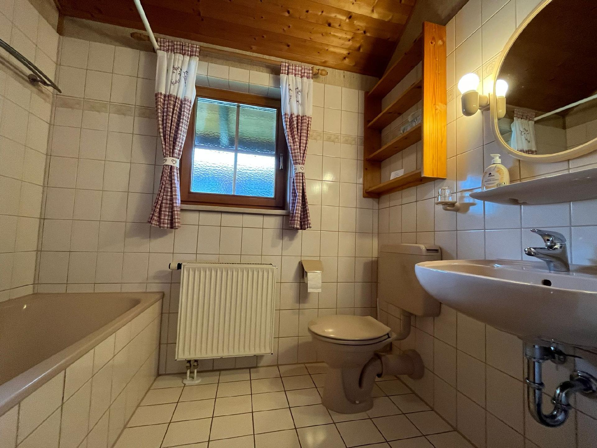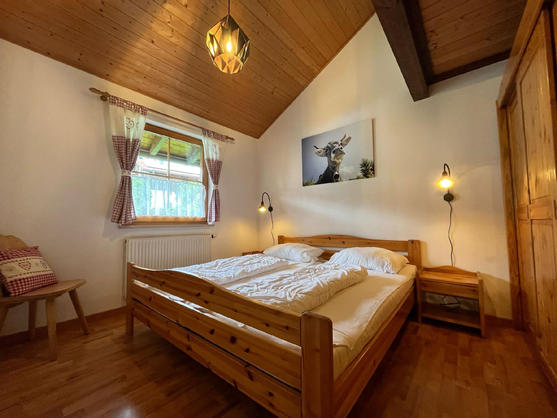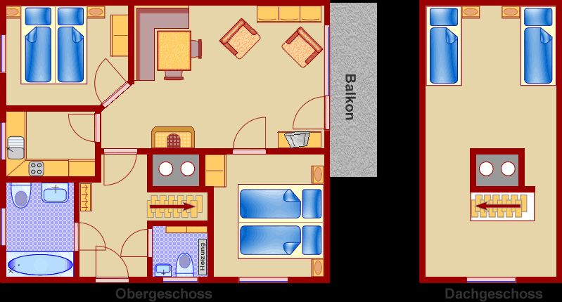 Die Innenausstattung umfasst alles, was Sie für einen sorglosen Aufenthalt benötigen. Die Küche ist komplett ausgestattet mit einem Kühlschrank, Herd, Backofen, einer Geschirrspülmaschine, Filterkaffeemaschine und Wasserkocher. Selbstversorger finden hier ausreichend Geschirr vor. Die Wohnung bietet zwei behagliche Schlafzimmer mit Doppelbetten, Kleiderschränken und Nachtkästchen. Für zusätzliche Gäste stehen im Dachraum zwei Einzelschlafplätze zur Verfügung. Alle Zimmer sind mit Fensterläden ausgestattet, die für Verdunklung sorgen und für einen erholsamen Schlaf beitragen. Das Tageslichtbad verfügt über eine Wanne mit Duschabtrennung, Waschbecken und WC. Ein zusätzliches Gäste-WC erhöht den Komfort.