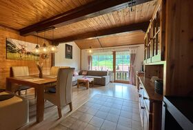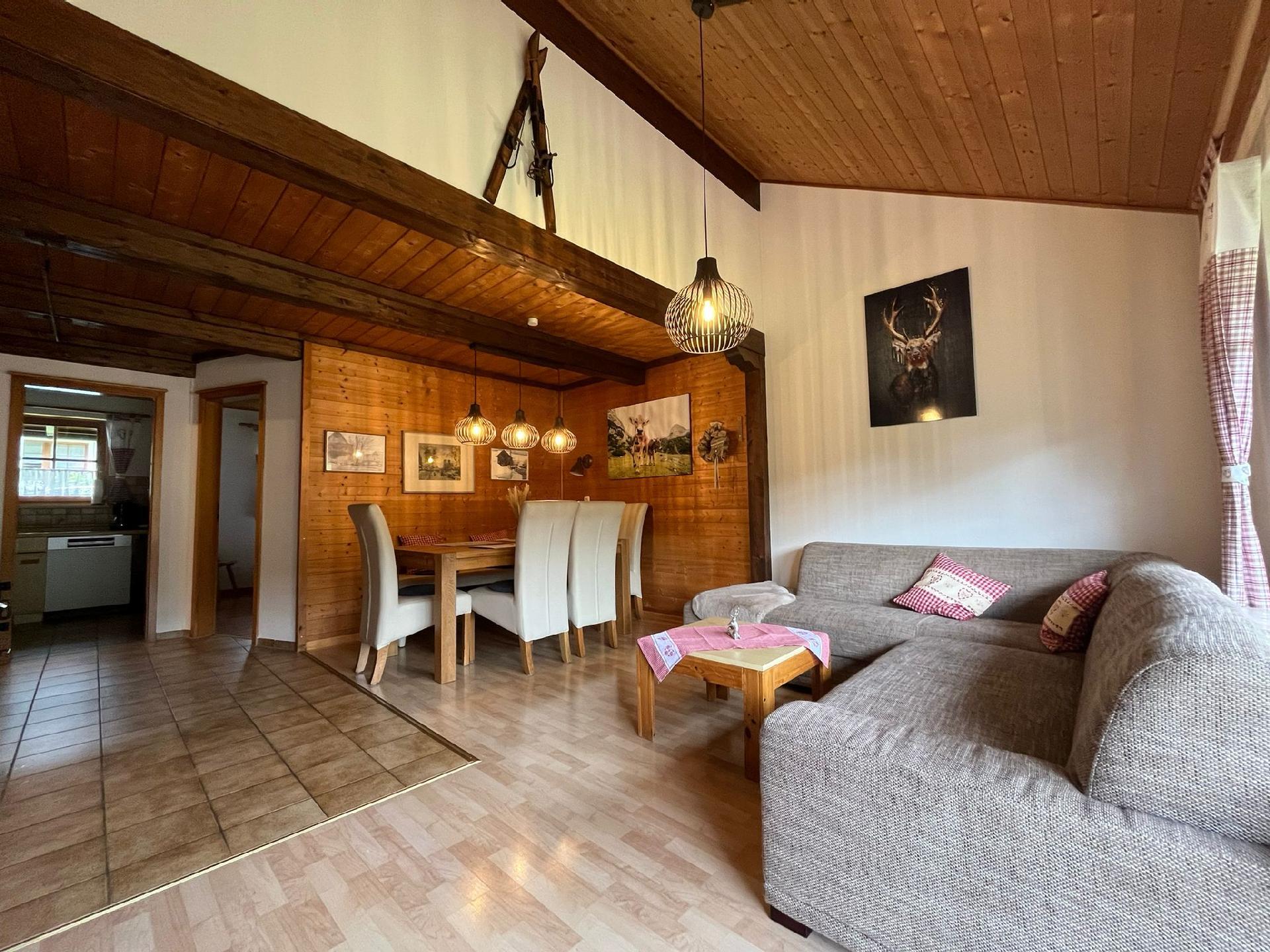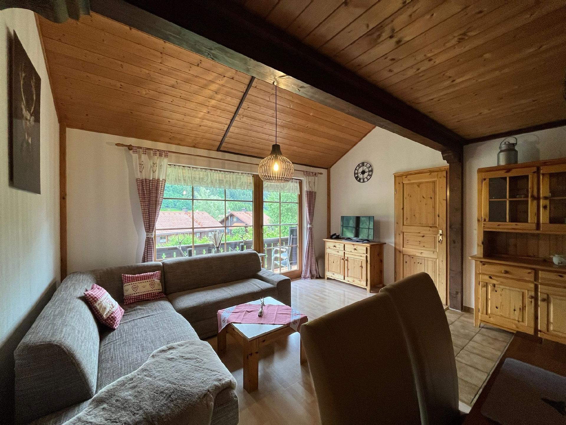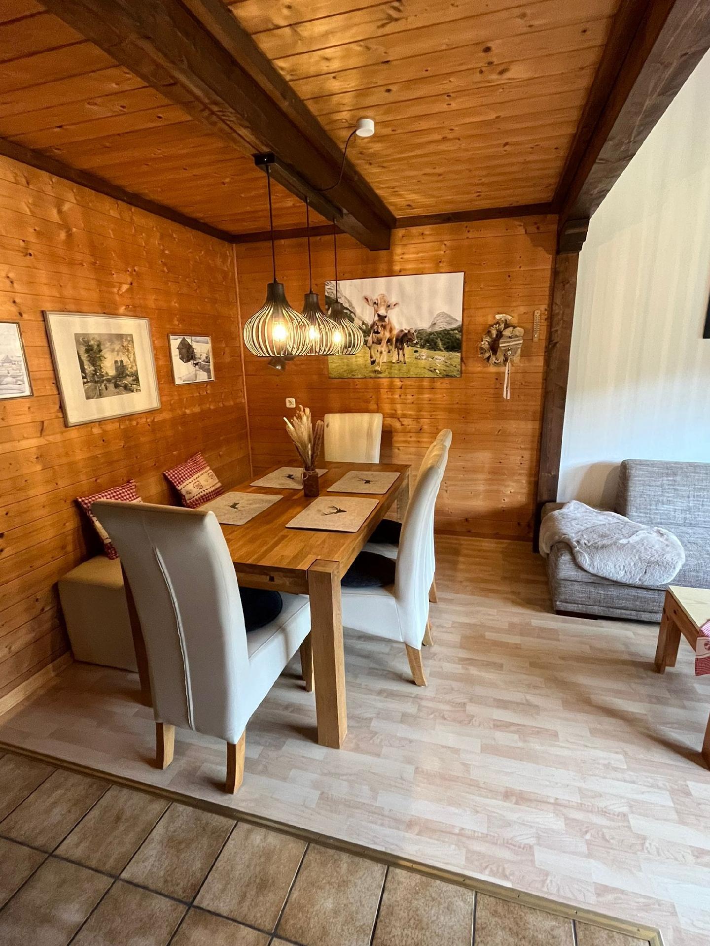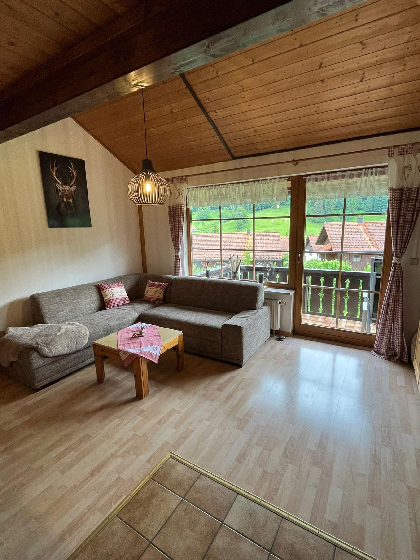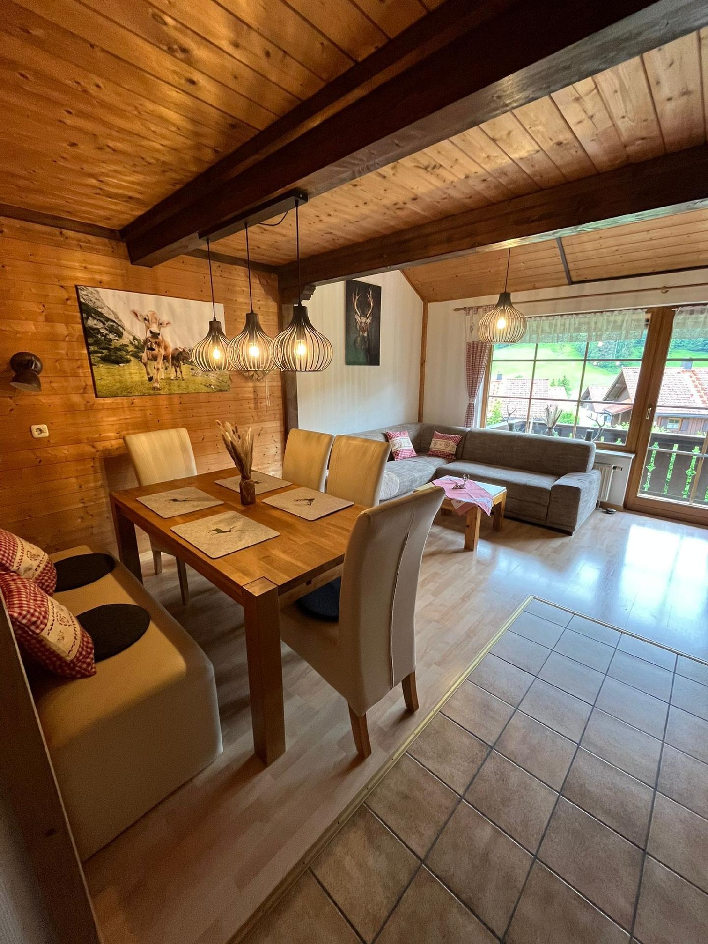 Herzlich willkommen in unserem charmanten Feriendomizil, das im traditionellen Allgäuer Stil eingerichtet ist. Genießen Sie die Ruhe und den Komfort unserer Ferienwohnung, die mit viel Liebe zum Detail gestaltet wurde. Vom gemütlichen Wohn-Esszimmer aus, das mit einer einladenden Couch und einem Essplatz direkt vor dem großen Panoramafenster ausgestattet ist, können Sie das malerische Panorama der Umgebung bewundern. Beginnen Sie hier Ihren Tag mit einem Frühstück und lassen Sie Ihren Blick in die Ferne schweifen, während Sie Ihre Aktivitäten planen.