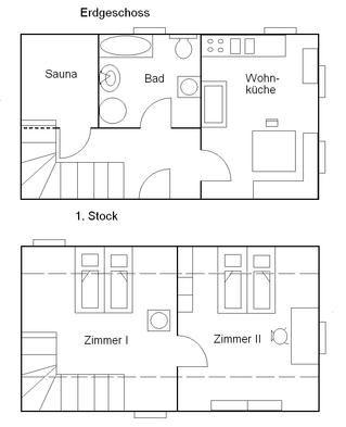 Im Innenbereich erwartet Sie eine liebevoll eingerichtete Wohnküche im Erdgeschoss, die keine Wünsche offenlässt, sowie ein modern ausgestattetes Bad und eine wohltuende Sauna, in der Sie nach einem ereignisreichen Tag entspannen können. Der erste Stock beherbergt zwei gemütliche Schlafzimmer, die Platz für insgesamt vier Personen bieten, wobei eines der Zimmer ein Durchgangszimmer ist. Auf Wunsch richten wir gern weitere Schlafmöglichkeiten, beispielsweise für Kinder, für Sie ein.