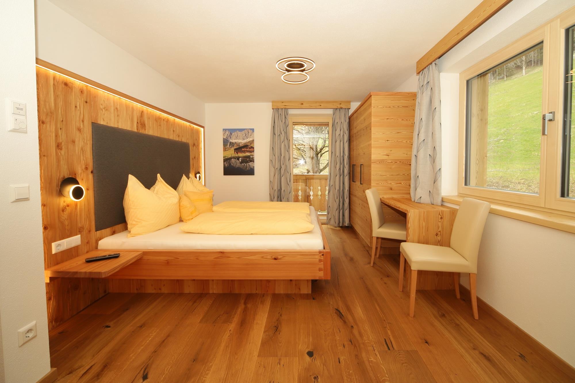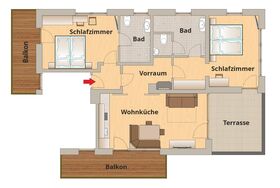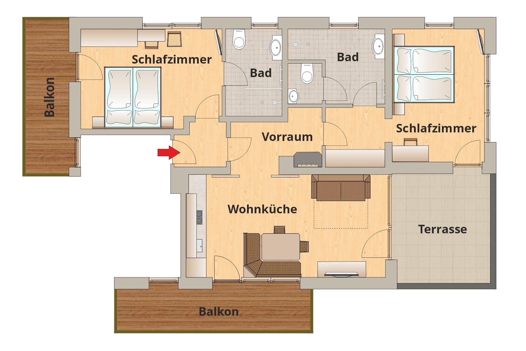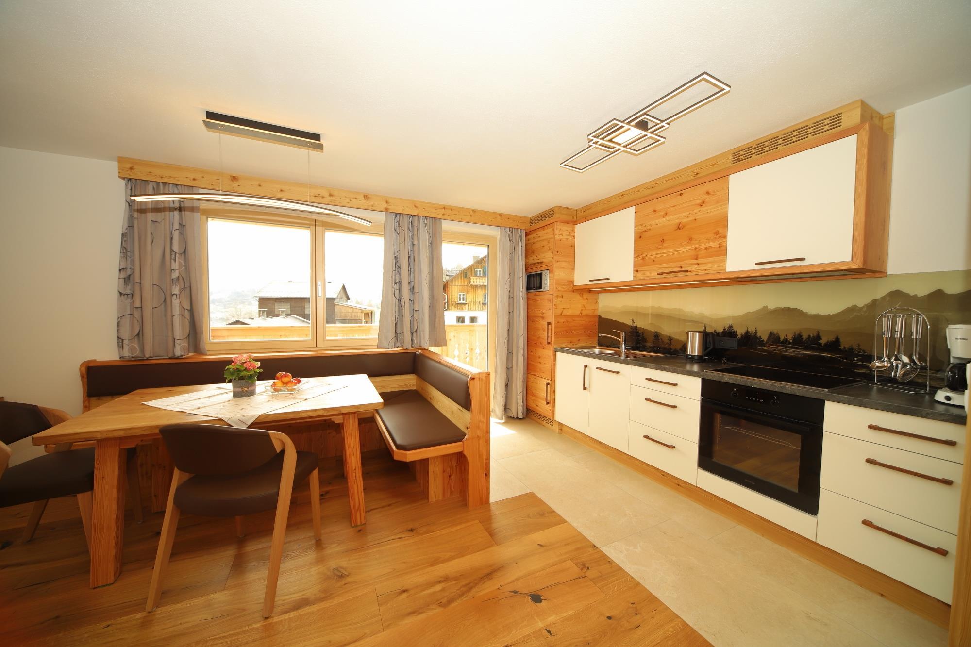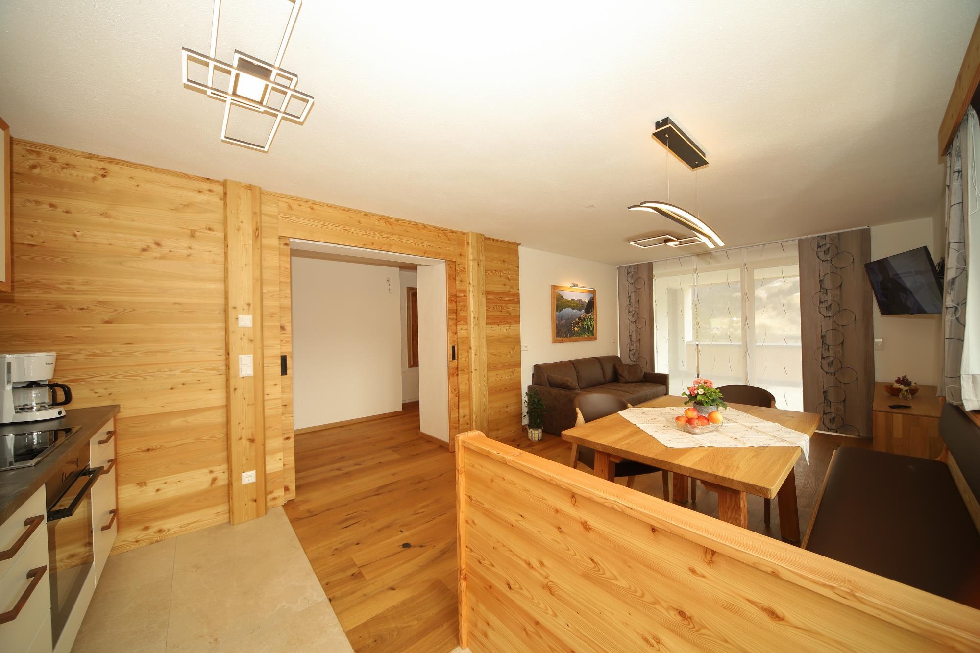 Modernes, mit Vollholz ausgestattetes, 78 m² großes Appartement für 2 bis 4 Personen. Geräumige Wohnküche, zwei Schlafzimmer mit jeweils einer Dusch/WC-Einheit und eine Terrasse mit herrlichem Panoramablick auf die Planai und die Schladminger Tauern.
