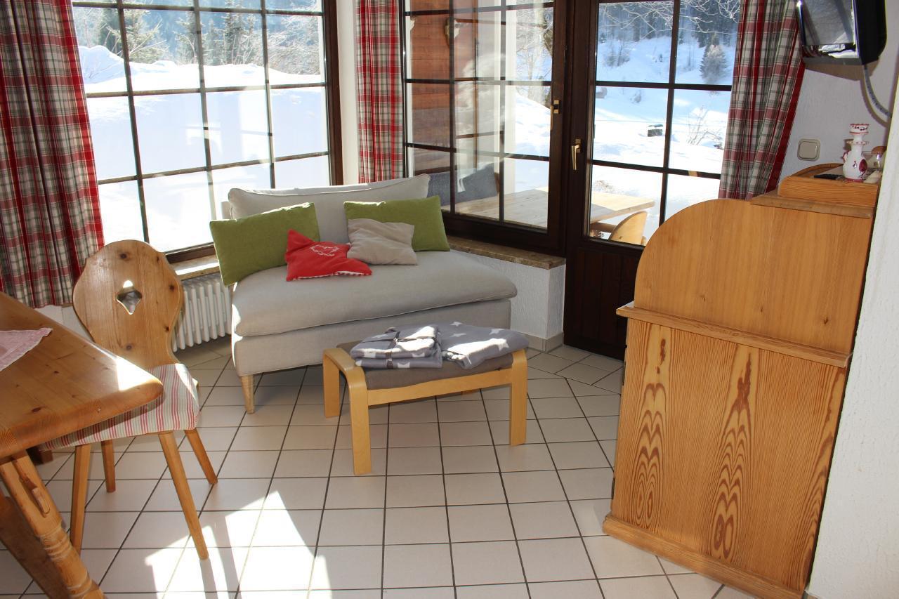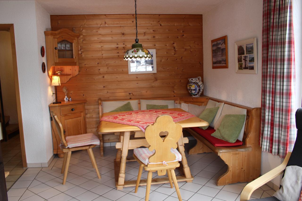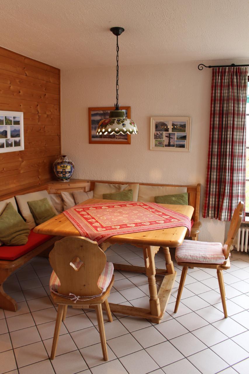 Über eine Treppe im Flur gelangt man ins UG mit einem hellen Wohnraum mit gemütlicher Essecke (Eckbank) im allgäuer Stil, kleinem Sofa und einem gemütlich Schwedenofen sowie Ausgang zur herrlichen Südterrasse und Garten. Das Wohn-/Eßzimmer ist ausgestattet mit Kabel-Farb-TV inkl. Radio und Internet-Anschluß. Die Küche mit 4-Platten-Herd / Backofen, Kühlschrank mit Gefrierfach erreichen Sie direkt aus dem Wohn-/Eßzimmer. Natürlich ist sämtliches Geschirr vorhanden sowie div. elektr. Geräte wie Wasser- u. Eierkocher, Toaster. Ebenfalls im UG befindet sich ein G-WC. Für Ihre Ski steht Ihnen die Skikammer vorm Haus zur Verfügung. Parkmöglichkeiten für Ihr Fahrzeug finden Sie direkt am Haus. Auf drei Etagen finden Sie also alles, was zu einem erholsamen Urlaub gehört.